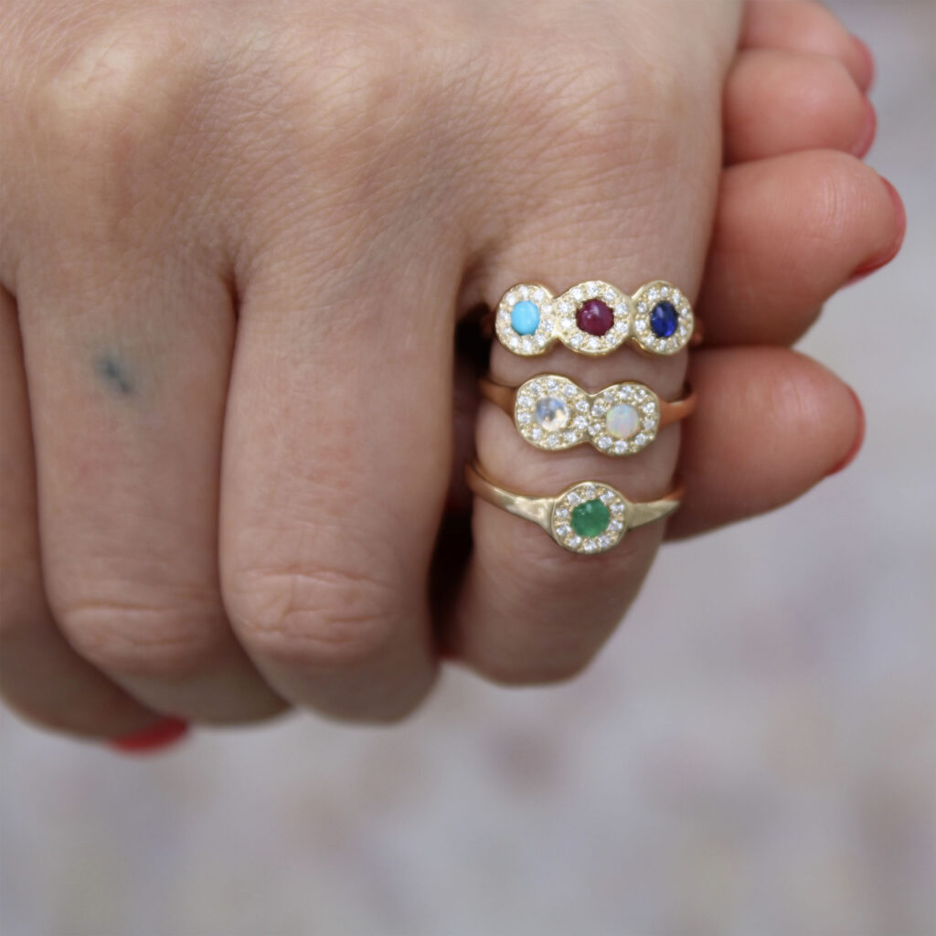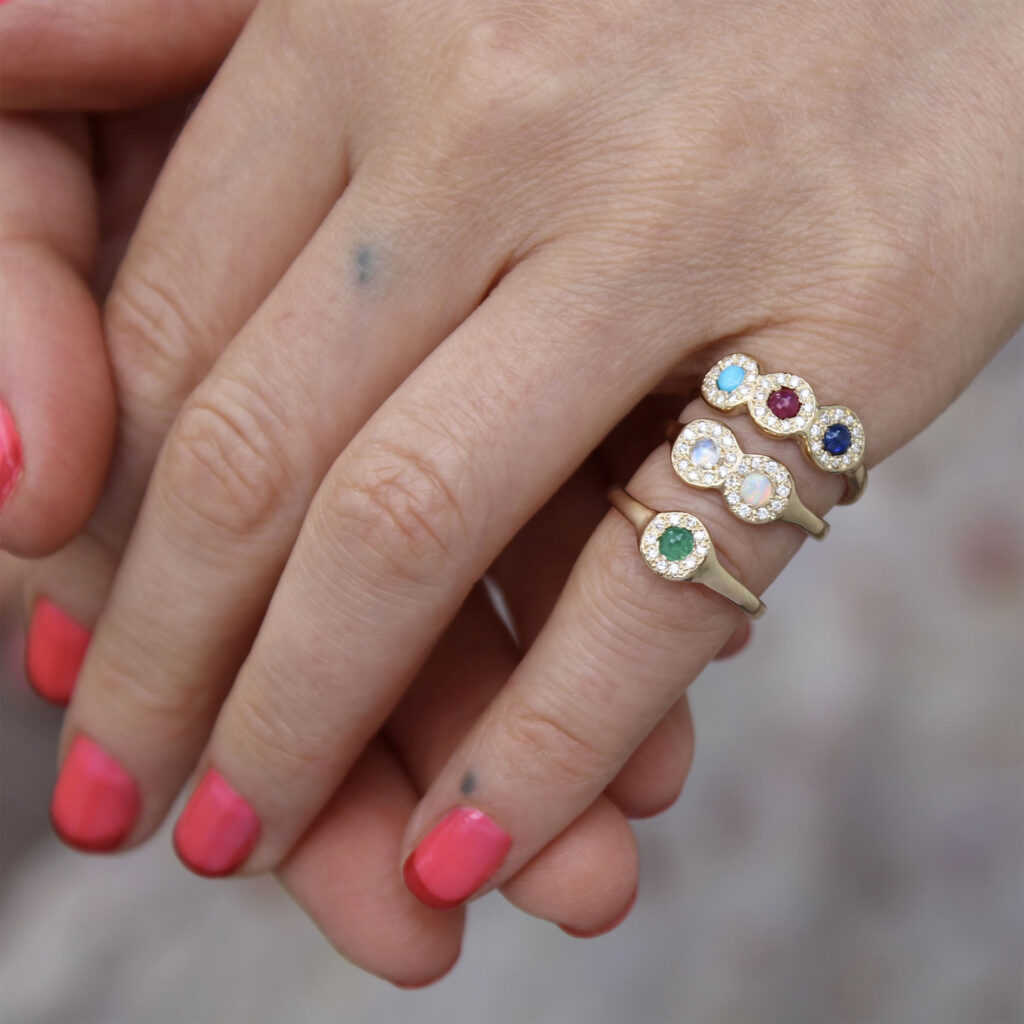 There are many signet rings in my collection and I wanted to create a new grouping that was completely different from the current styles. I’ve really loved working with a selection of 3mm birthstone cabochons and faceted gems, so I decided to make them the focal point of my new rings. Many of my jewels allow for personalization and I find honoring loved ones is meaningful to all. I decided to make three versions of this new ring to allow for even more personalization.