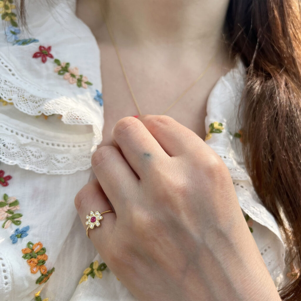 I love carving organic floral jewels and translating their unique shapes into sweet creations with juicy gems and precious metal. I had a pile of birthstones on my desk and felt so drawn to all the pretty colors. I thought they would make the perfect center for a new flower! Introducing the Birthstone Bohemian Flower Charm and Birthstone Bohemian Flower Ring.