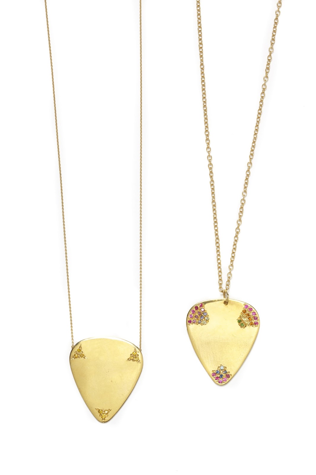 Jewelry of the Day features both of my 18 karat yellow gold guitar pick necklaces. One is set with yellow diamonds, and the other is encrusted with various colorful stones!!!!! Selby, the editor, writes “You’re at the office but feeling like a Rolling Stone. Slip on a bejeweled guitar pick.”