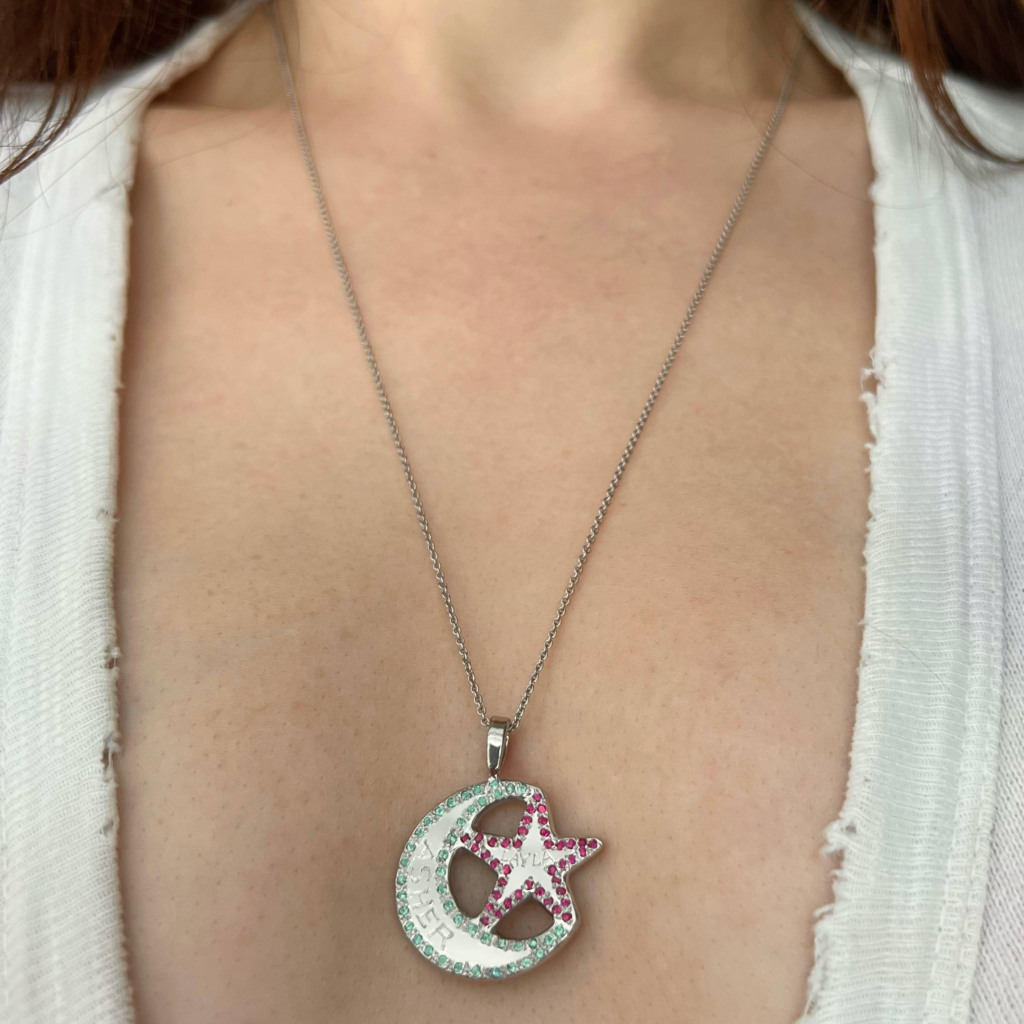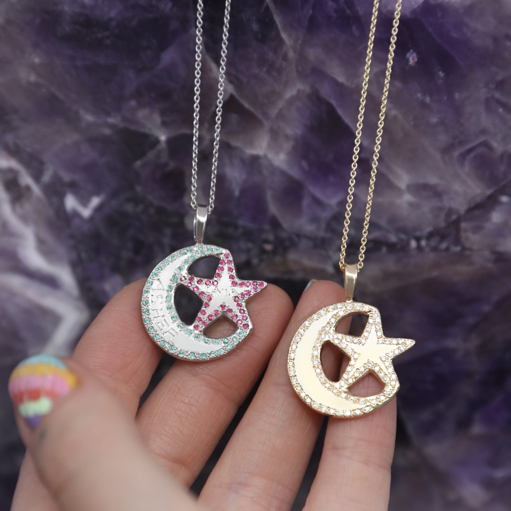 In March, I was looking through images of Stevie because I love her style and one picture in particular caught my eye. She was wearing a moon and star necklace. I immediately knew I had to Elisa-fy the necklace! I carved a connected moon and star shape and decided it must have my signature personalization offerings. In a sample, I set the moon with my son’s birthstone, alexandrite, and the star with my daughter’s birthstone, ruby. Their names were hand-engraved in the respective shapes. And with that, the Moon and Star Charm Necklace was born!