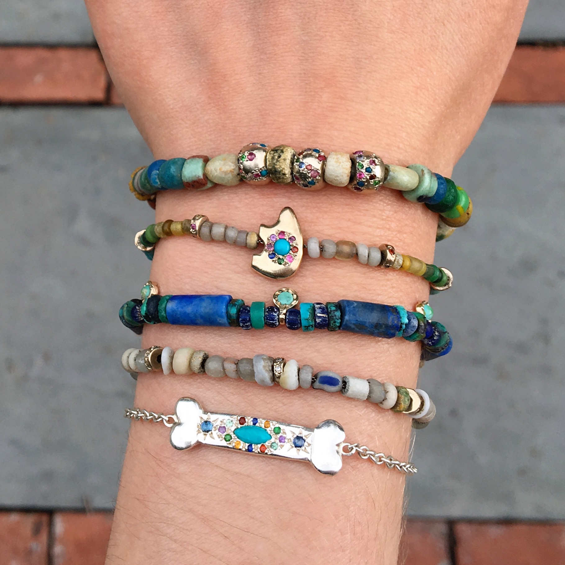 The perfect jewel to celebrate your canine best friend. This sterling silver dog bone ID bracelet is set with multicolor gems including garnet, citrine, tsavorite, alexandrite, aquamarine, blue sapphire, iolite, amethyst, rhodolite, and pink sapphire. The ID can be engraved with your loved one’s name. Handcrafted by Elisa.