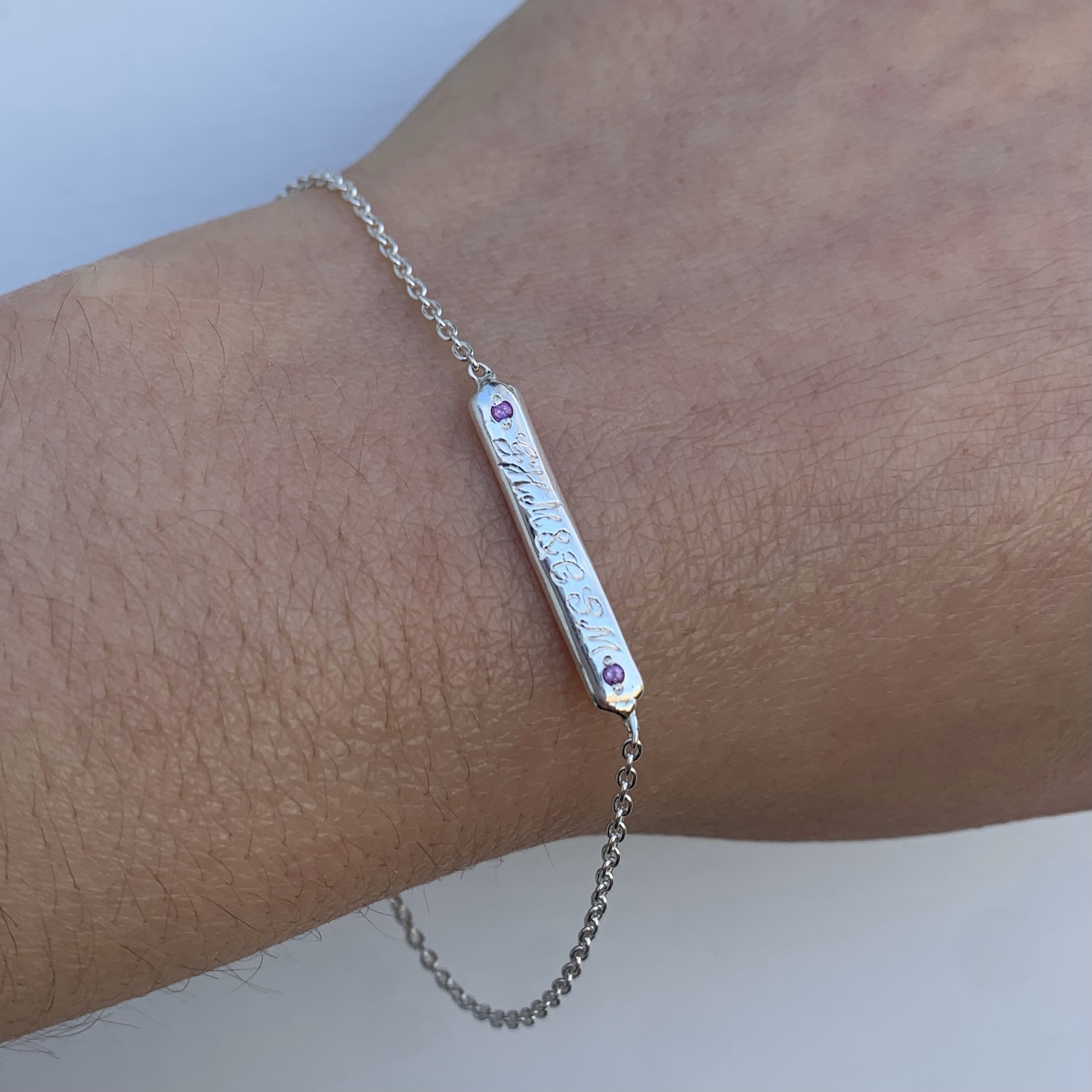 A classic skinny sterling silver ID bracelet set with 2 gemstones of your choice (shown here with turquoise). Engraving is available. Handcrafted by Elisa.