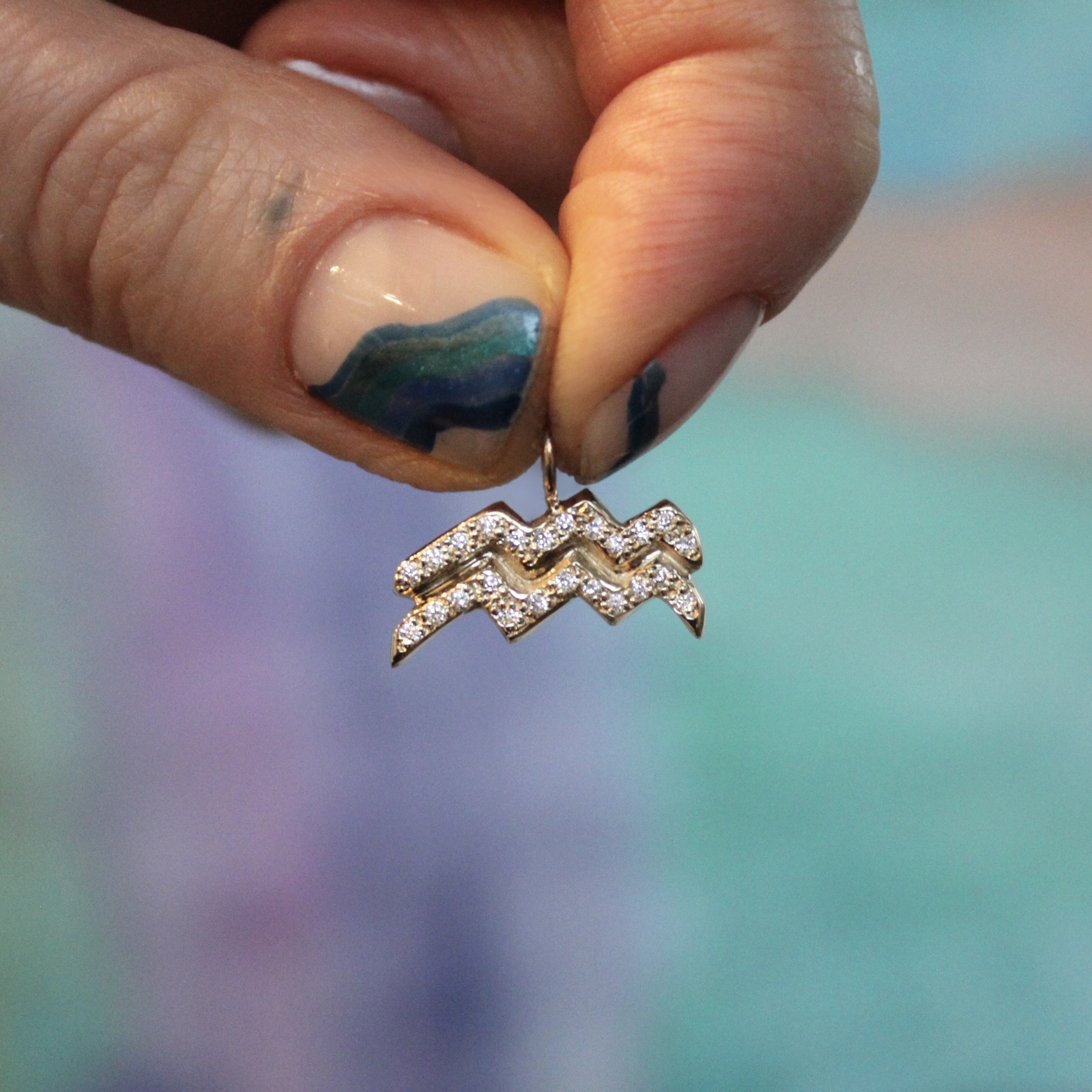 This hand carved zodiac charm is a classic personalized piece that celebrates astrology. The perfect gift, select your favorite gems or meaningful birthstones. This 14 karat gold Aquarius charm is available in yellow, pink, white gold, or platinum. Aquarius symbolizes birthdays between January 20- February 18. The symbol reflects a water bearer and is represented by two parallel water ripples or zigzagging lines. Aquarius is often associated with amethyst. Handcrafted by Elisa.