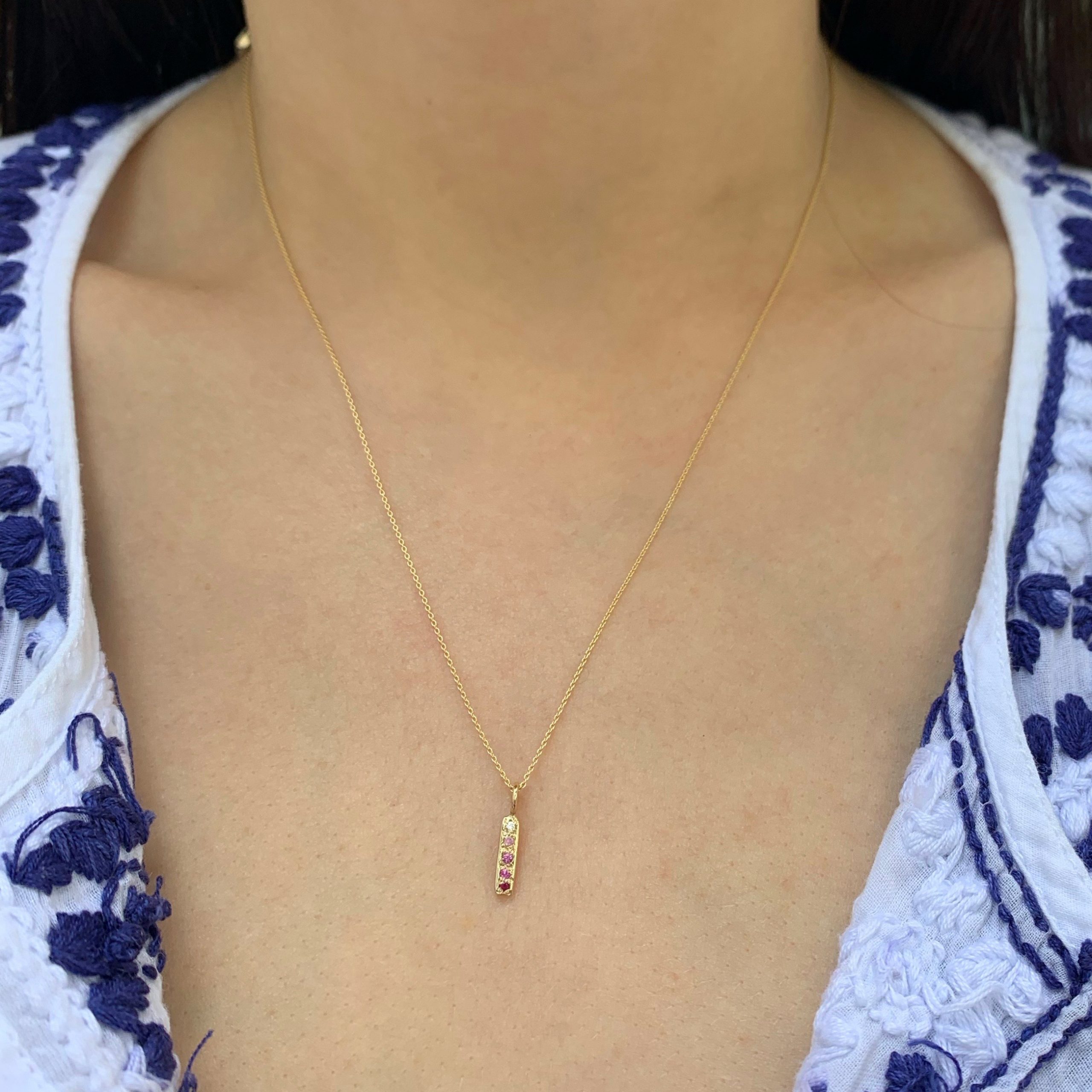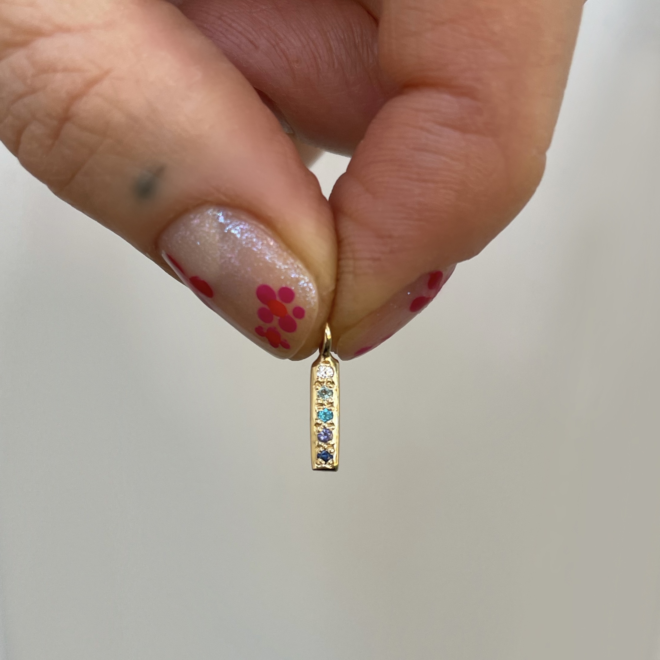 This hand carved skinny bar charm is a classic piece. The 14 karat yellow gold skinny bar is set with white diamond, alexandrite, apatite, iolite, and blue sapphire. A sentimental, special jewel. Handcrafted by Elisa.