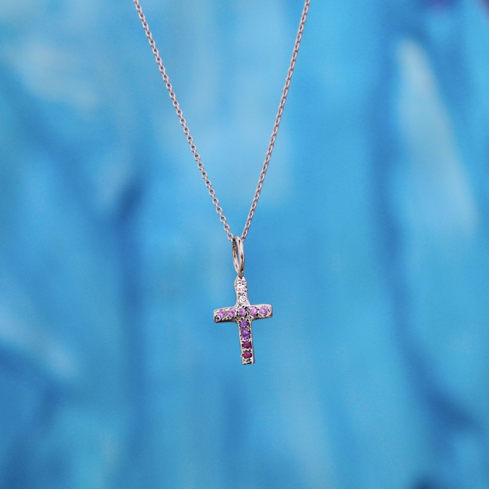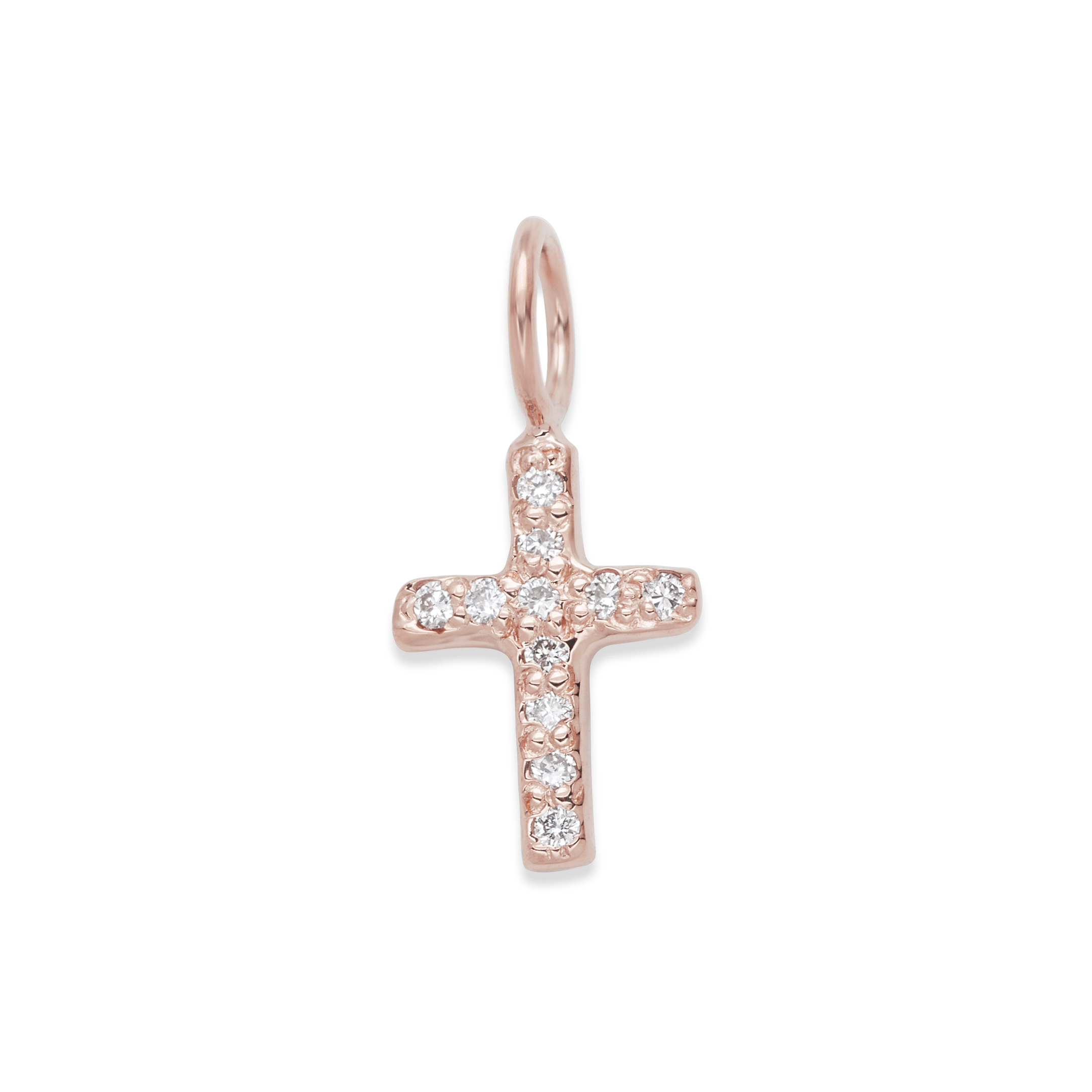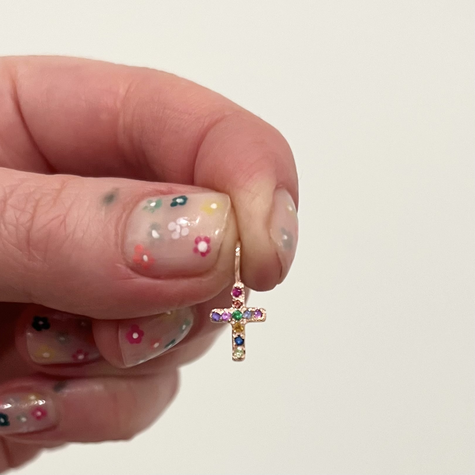 A classic symbol personalized with your favorite diamonds, gems, or meaningful birthstones. This 14 karat gold cross charm is available in yellow, pink, or white gold. Handcrafted by Elisa.