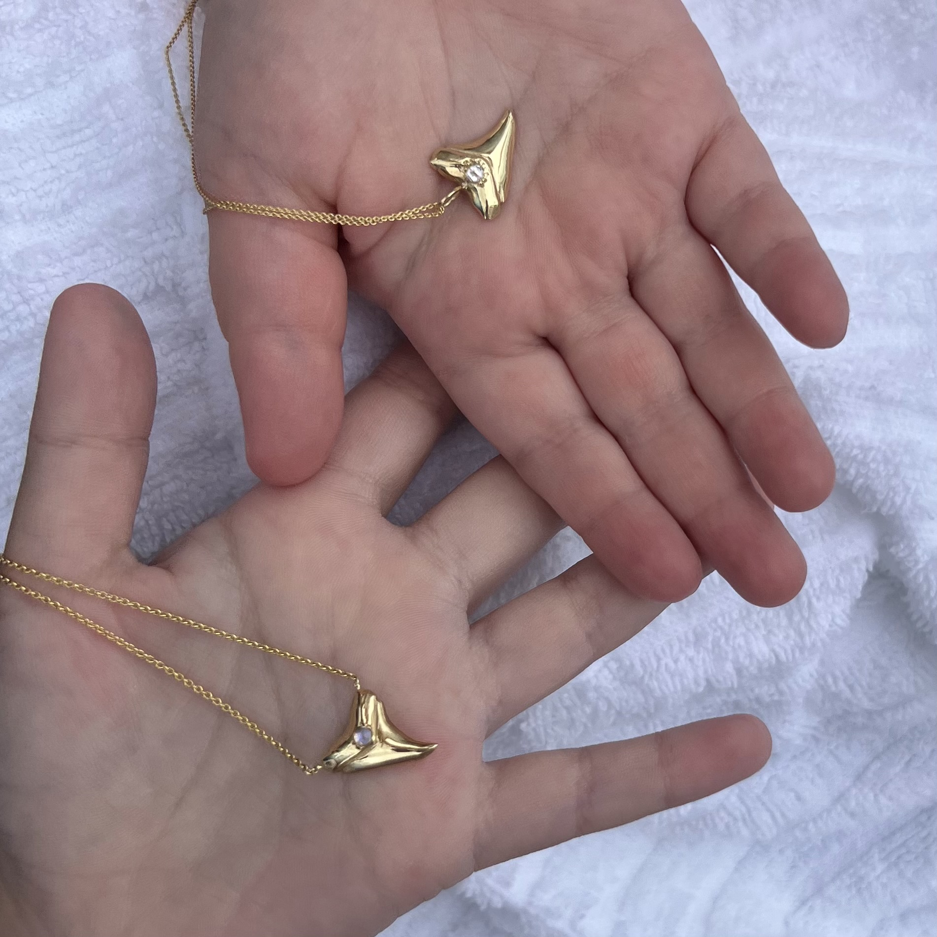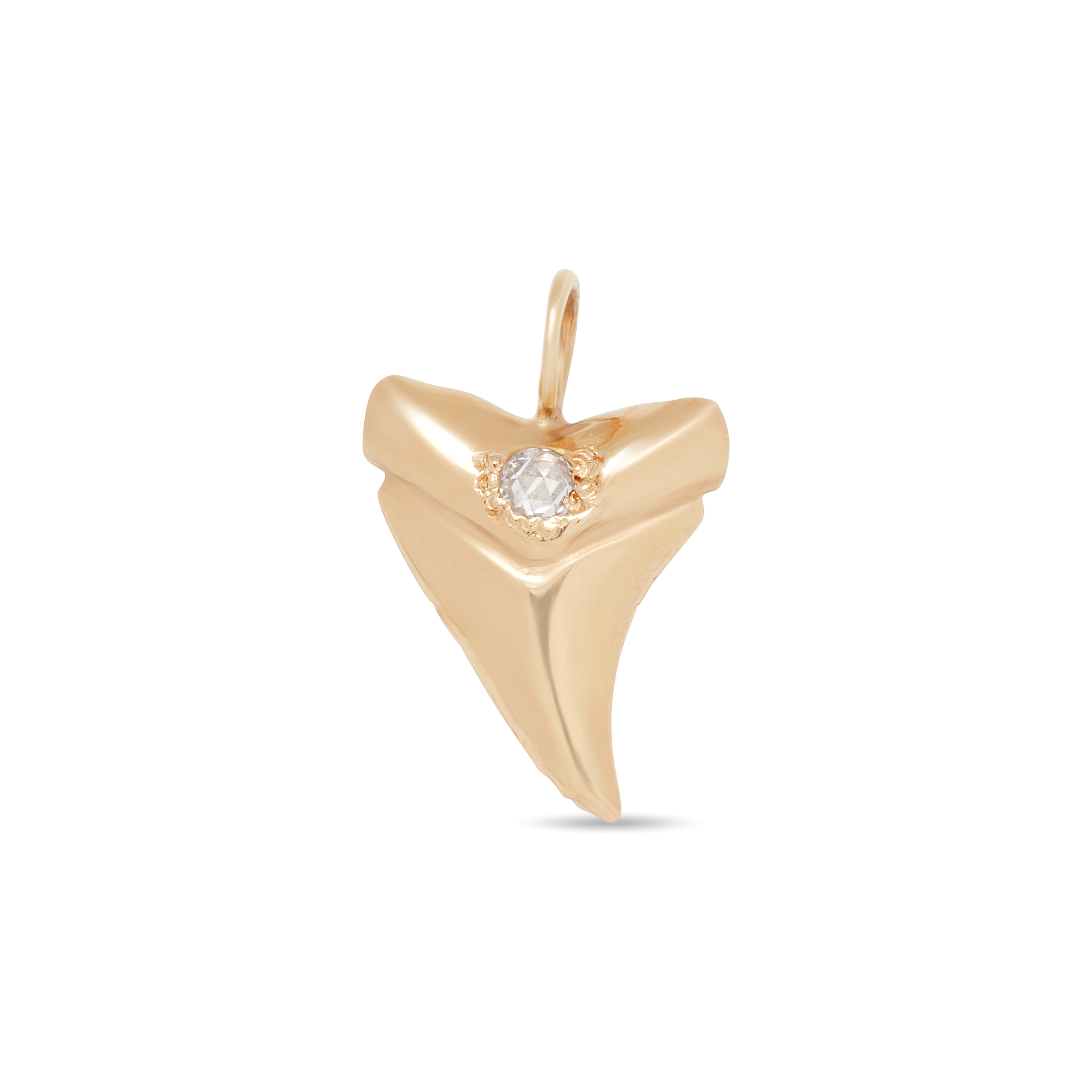 Inspired by the beach, this 14 karat gold shark tooth charm is set with a precious gemstone cabochon or rosecut white diamond. The back is hand engraved. This 14 karat gold shark tooth charm is available in yellow, pink, or white gold. Handcrafted by Elisa.