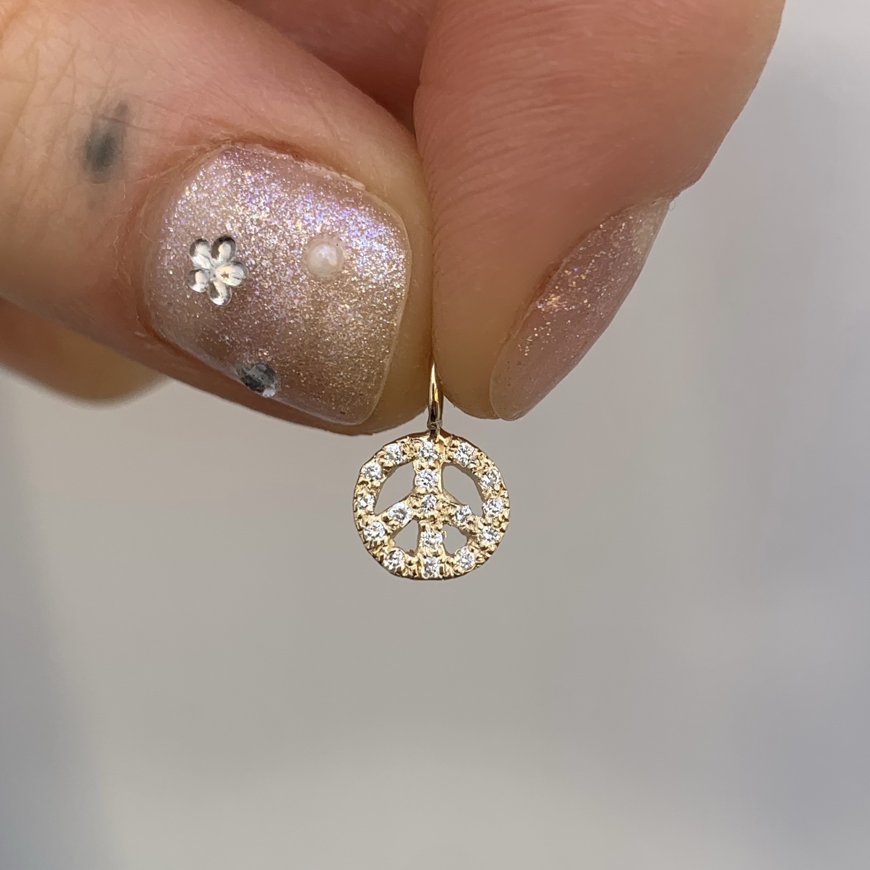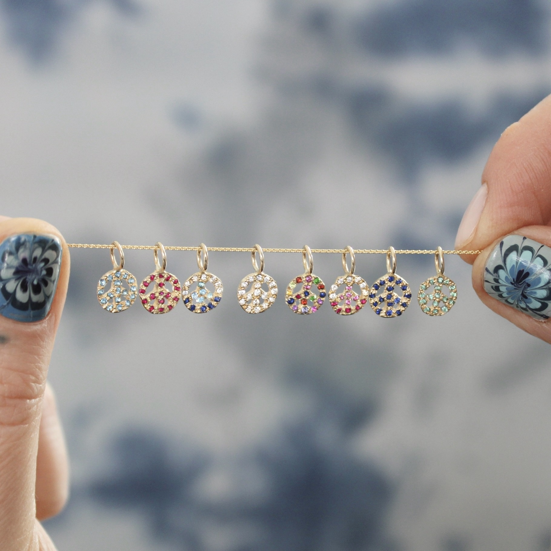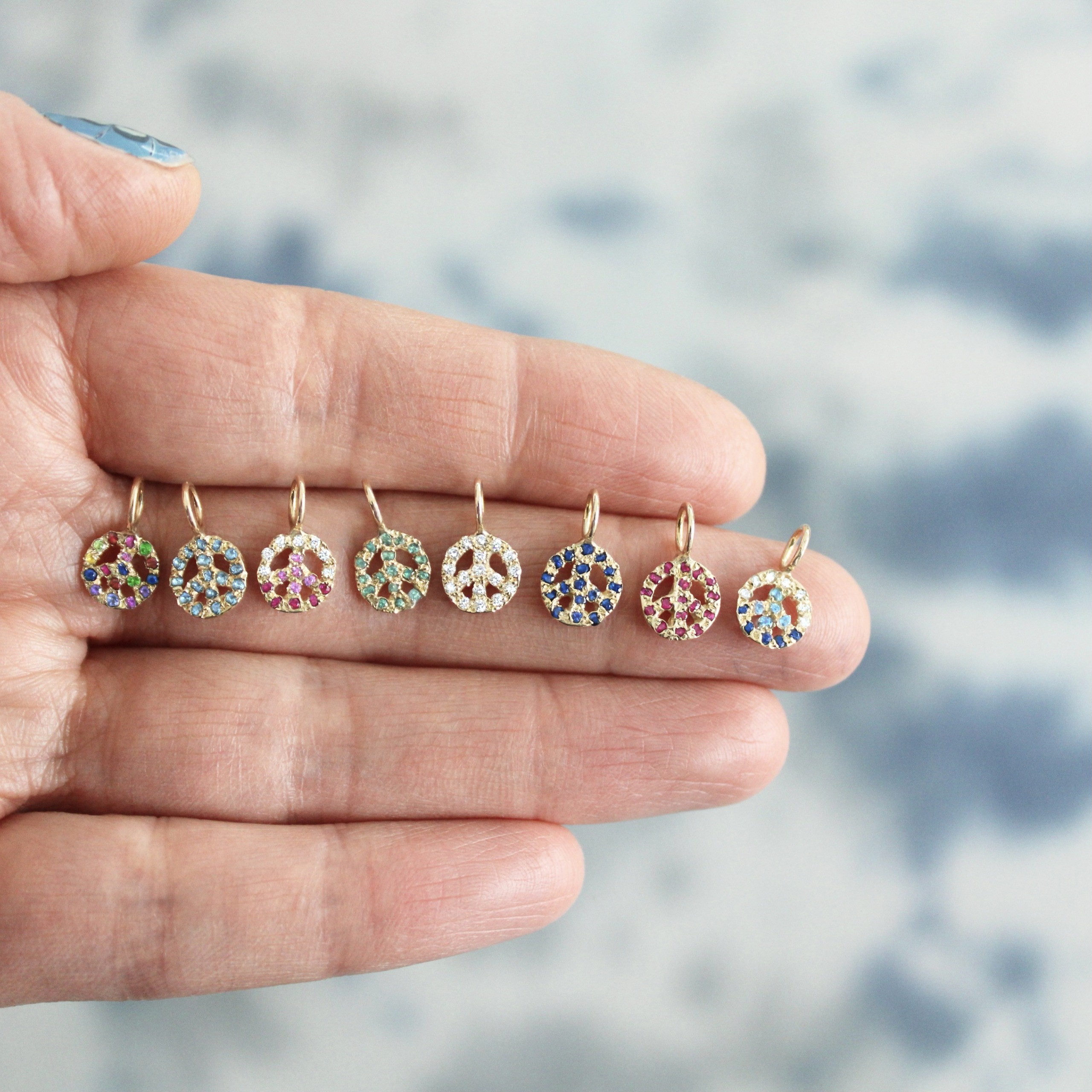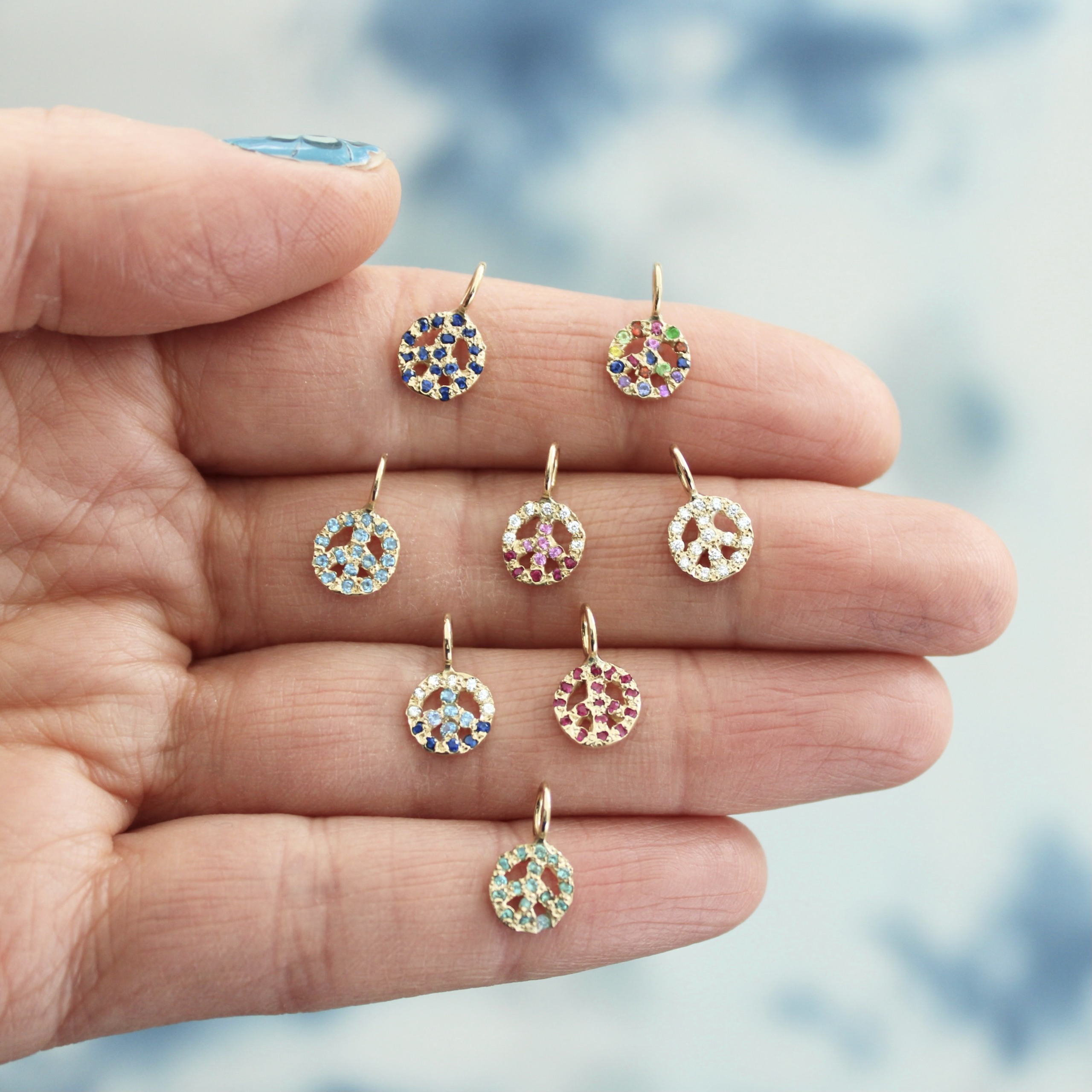 This hand carved peace charm is a classic. The peace sign is set with approximately 17 gemstones of your choice. These options include rainbow, multicolor, blue ombre, and pink ombre, or a meaningful birthstone. This 14 karat gold peace charm is available in yellow, pink, or white gold. Handcrafted by Elisa.