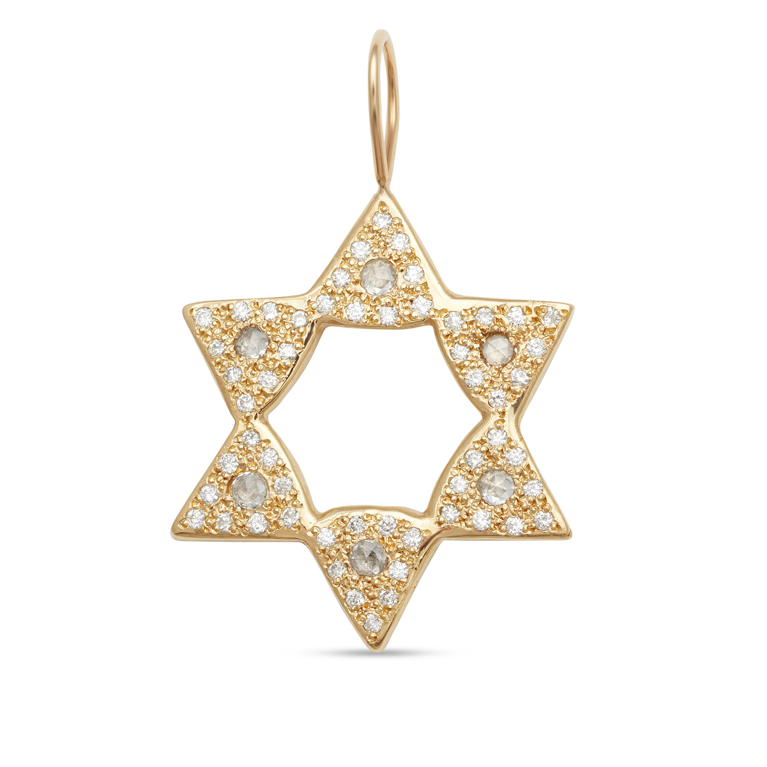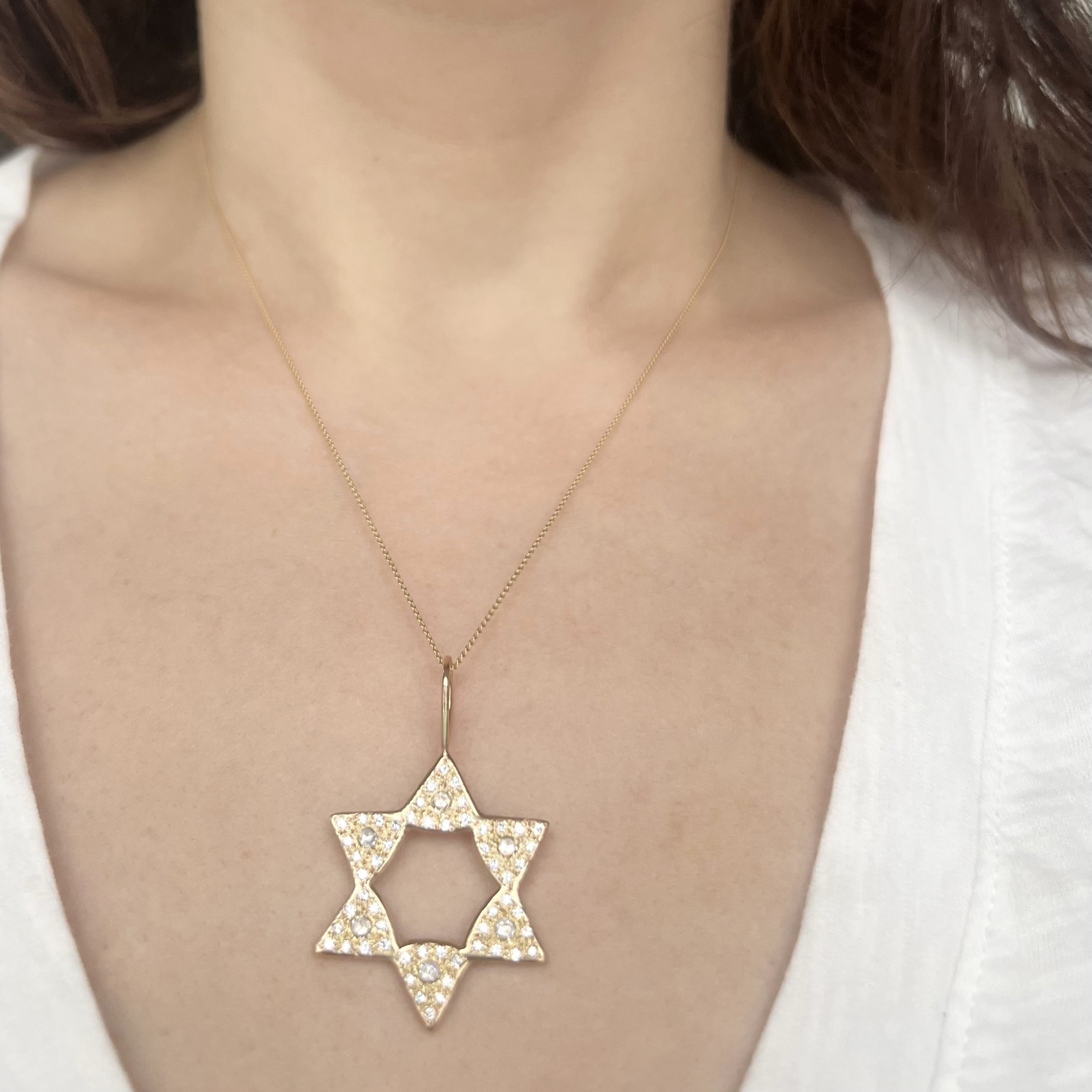 A beautiful 6 point star of David. This 14 karat yellow gold star charm is set with diamonds. The six points are set with a 2mm rosecut white diamond center. Nine white diamonds are set around each of the six rosecut diamonds. Handcrafted by Elisa.