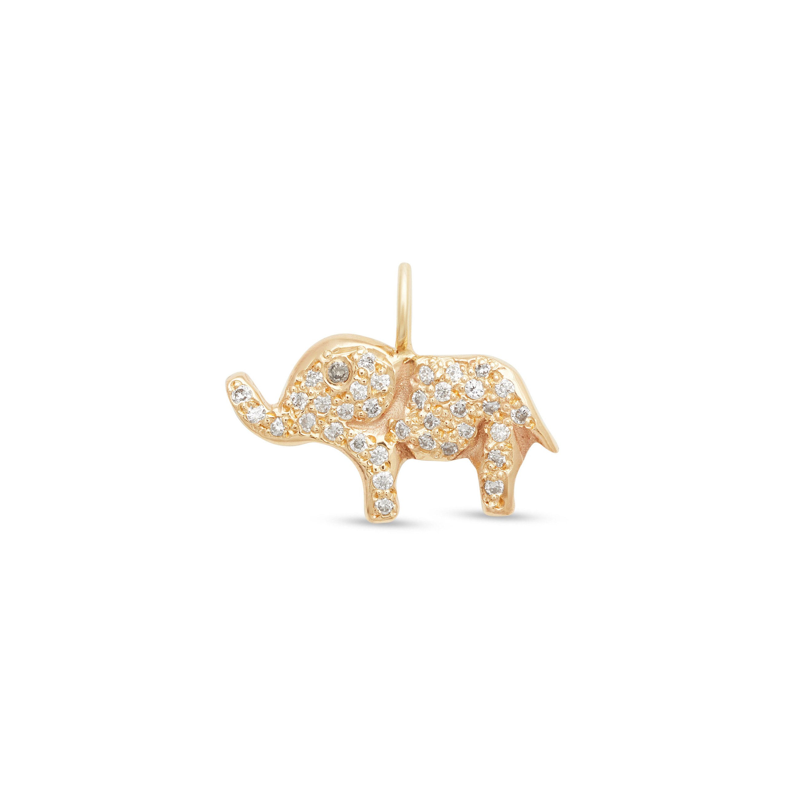 The perfect jewel for an animal lover. The elephant charm is set with a brown diamond eye and white diamond encrusted body. There are thirty-four white diamonds. This 14 karat gold elephant charm is available in yellow, pink, or white gold. Handcrafted by Elisa.