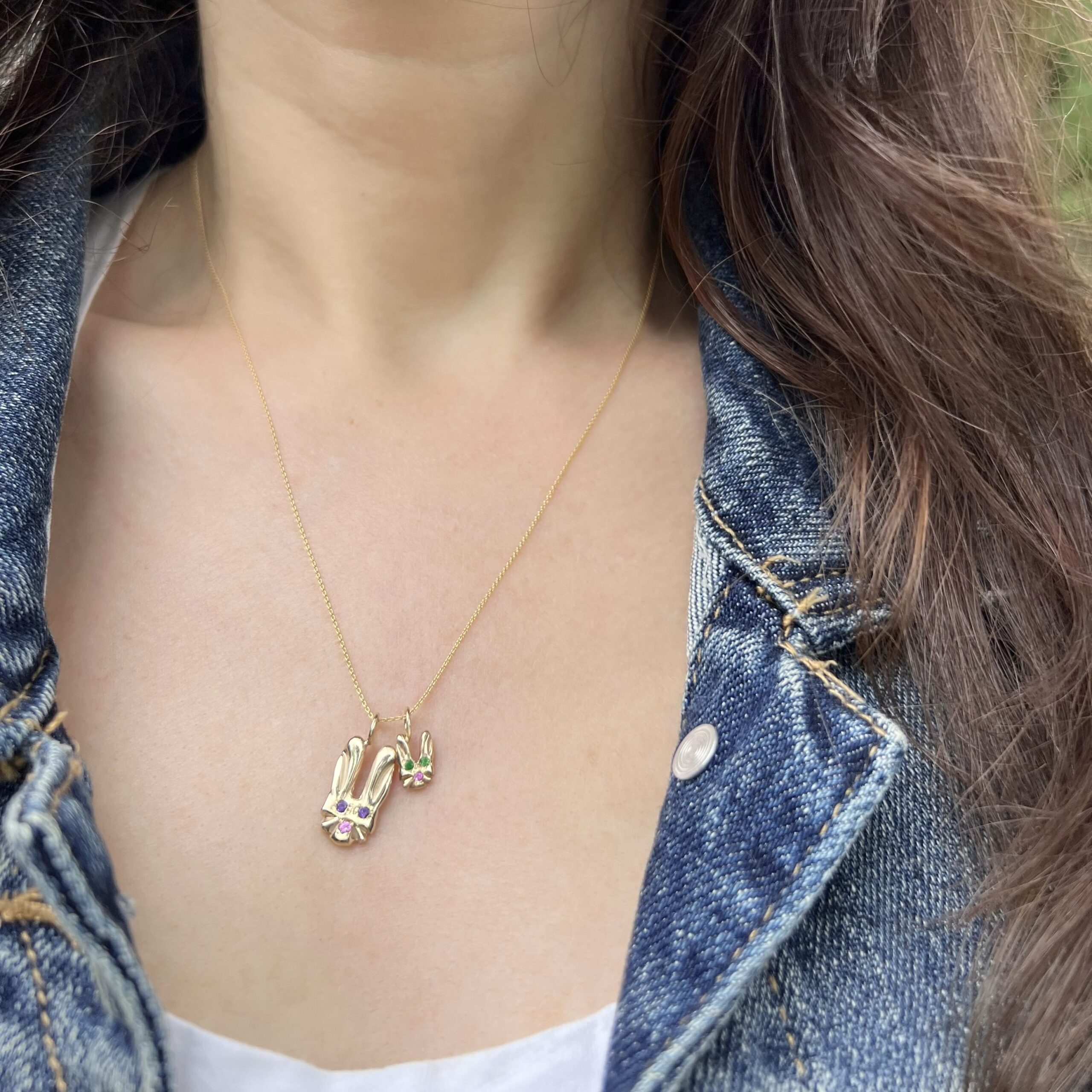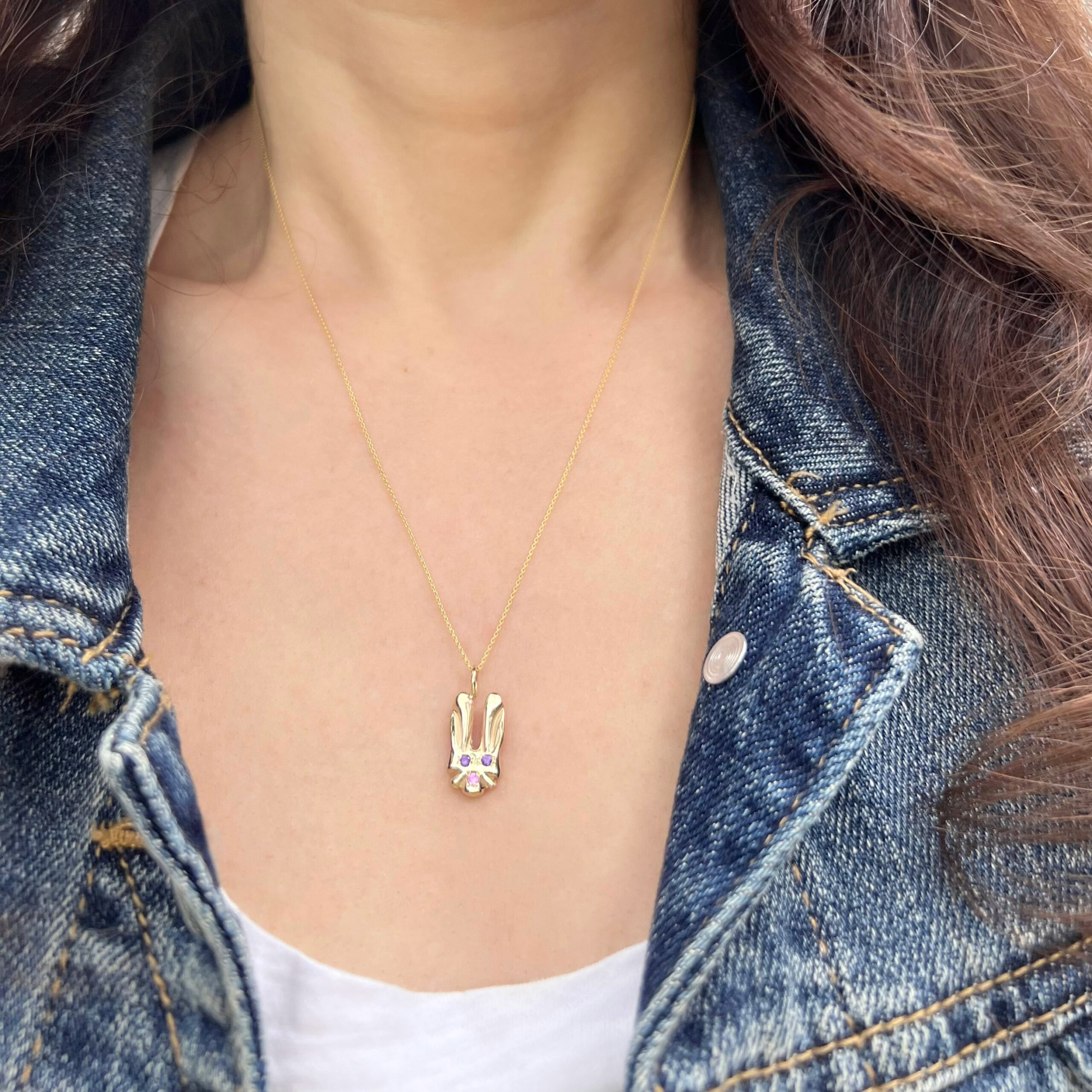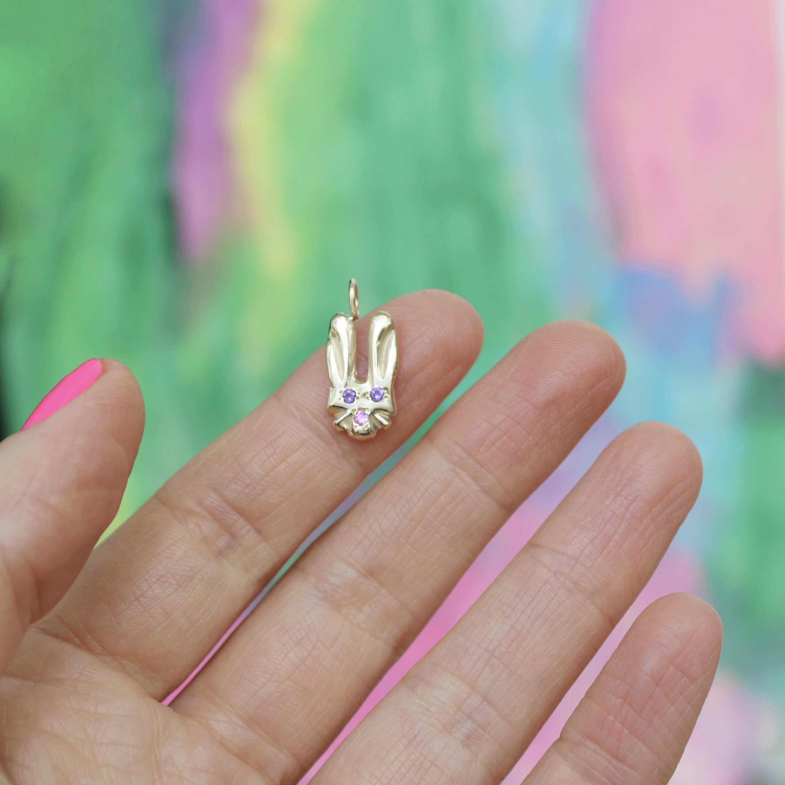 A sweet animal favorite! This precious large bunny charm is set with amethyst eyes and a pink sapphire nose. This 14 karat gold bunny charm is available in yellow, pink, or white gold. Handcrafted by Elisa.