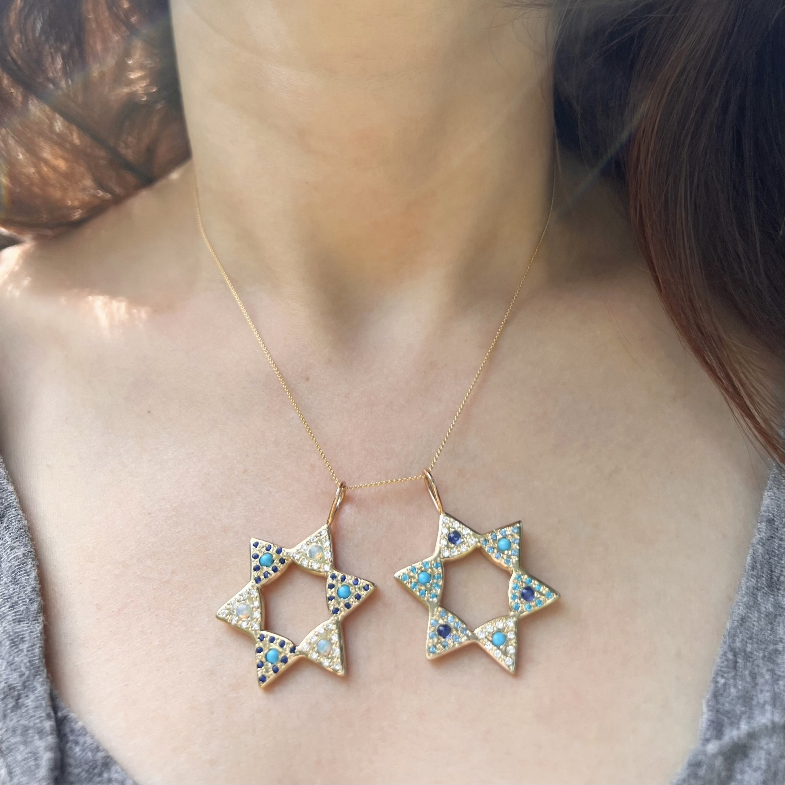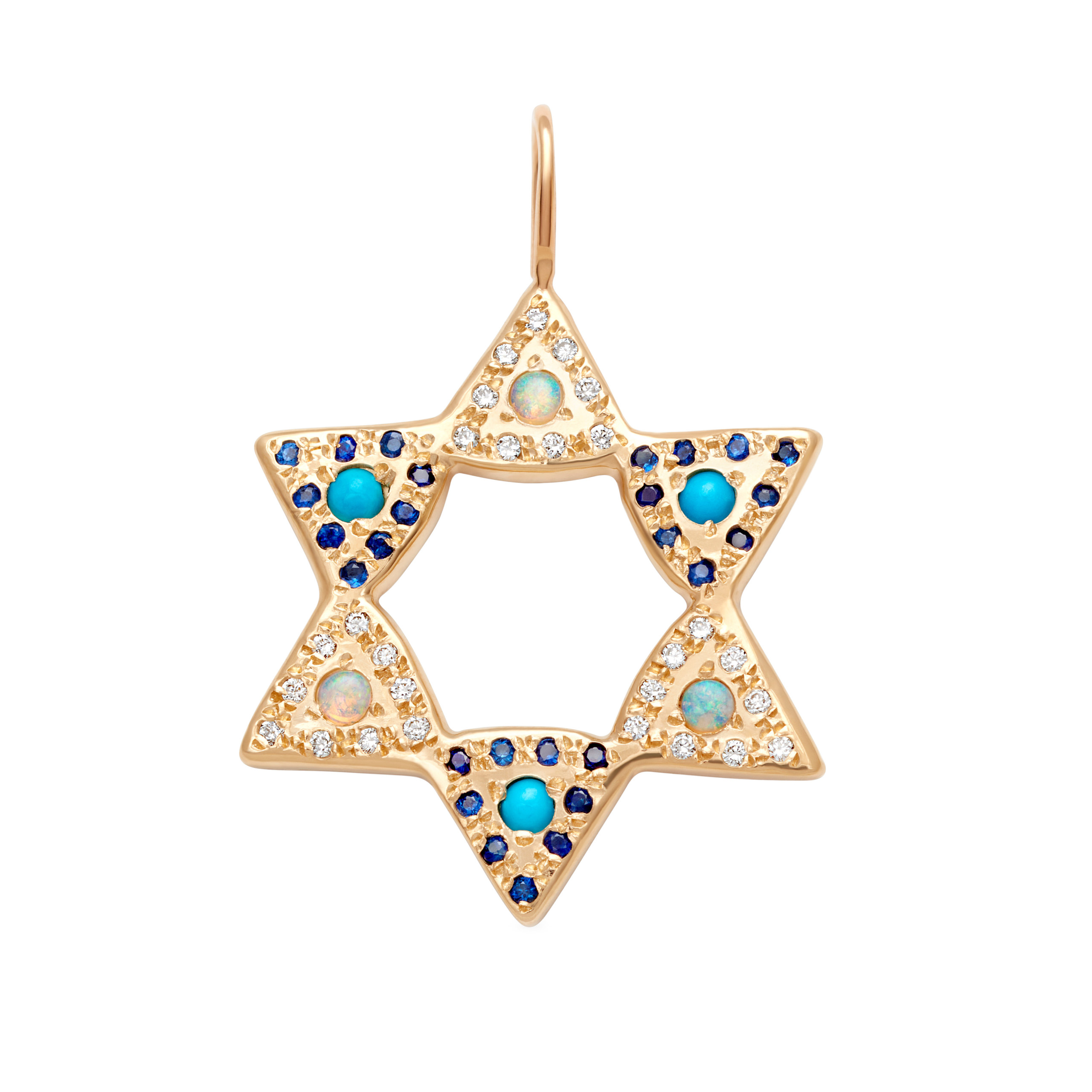 A beautiful 6 point star of David. This 14 karat gold star charm is available in yellow, pink, or white gold. The points are set with opal and turquoise cabochons. There are a total of three opal cabochons and three turquoise cabochons. White diamonds and blue sapphires are set around the cabochons. There are nine stones set around each cabochon. Handcrafted by Elisa.
