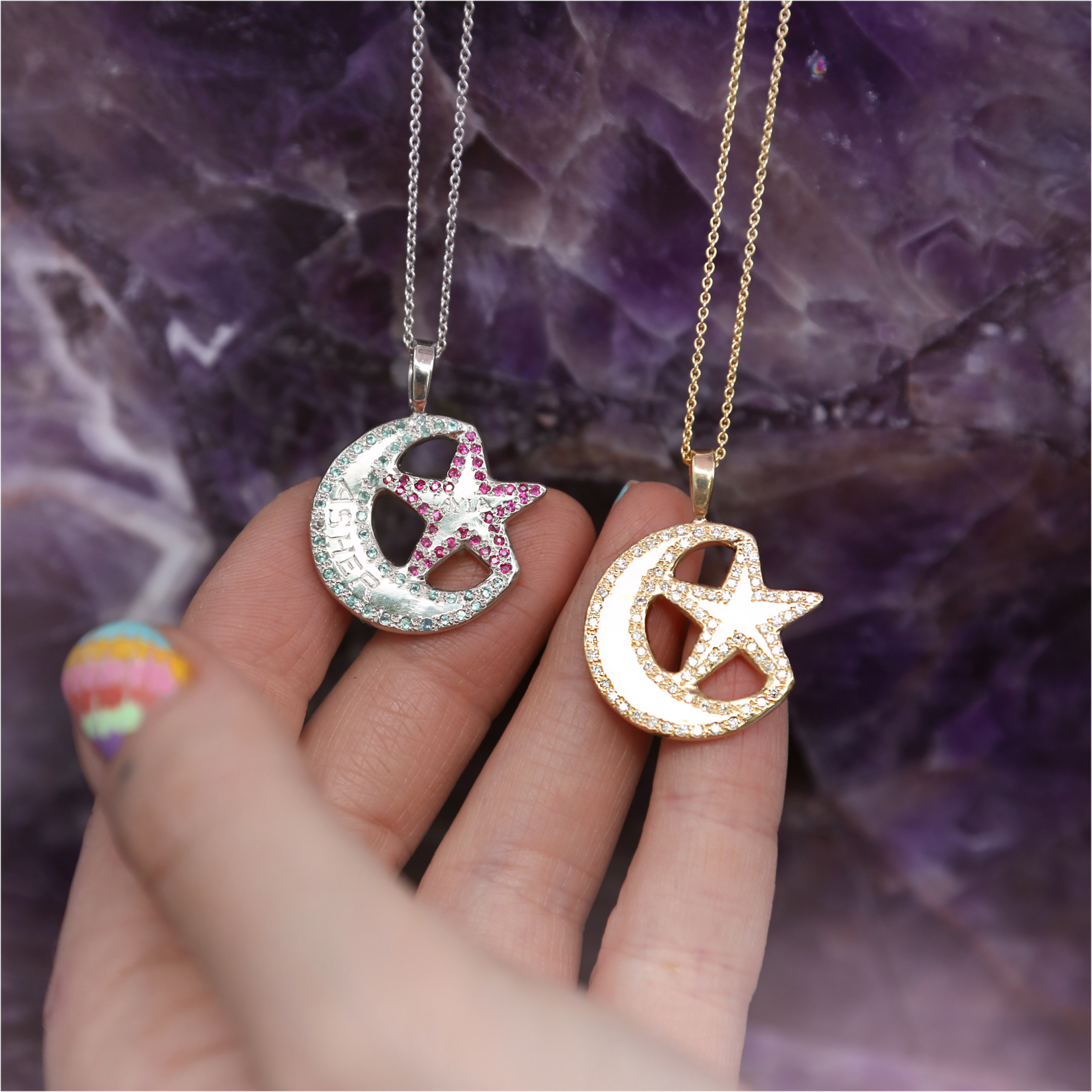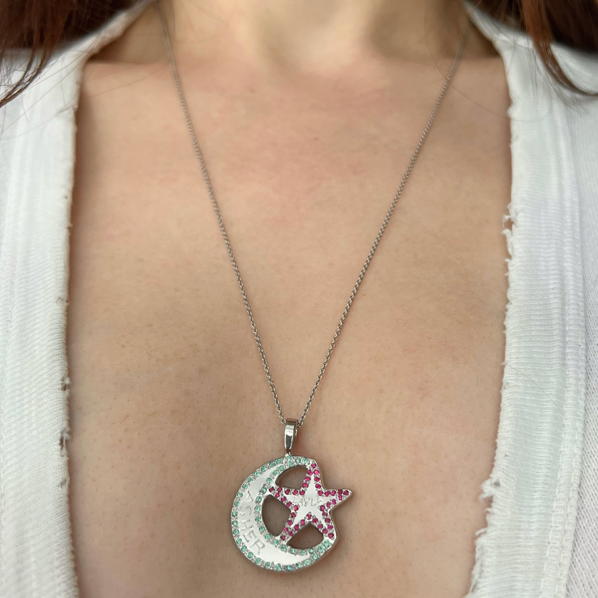 The moon and star charm necklace is a very special piece. There is a beautiful weight to the pendant. This necklace is super unique because the moon and star can each be personalized with diamonds, colorful gems, or meaningful birthstones. The center of both the moon and star are hand engraved with a meaningful name, word, or initial. This necklace is available in platinum, or 14 karat yellow, pink, or white gold. Handcrafted by Elisa.