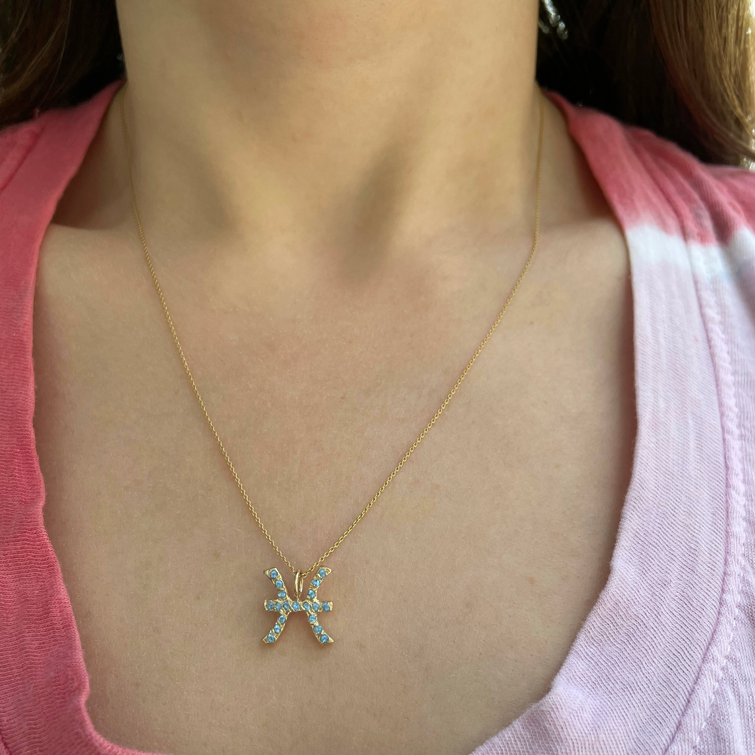 This hand carved zodiac charm is a classic personalized piece that celebrates astrology. The perfect gift, select your favorite gems or meaningful birthstones. This 14 karat gold Pisces charm is available in yellow, pink, white gold, or platinum. Pisces symbolizes birthdays between February 19- March 20. The symbol reflects two fish swimming in opposite directions. Pisces is often associated with aquamarine. Handcrafted by Elisa.