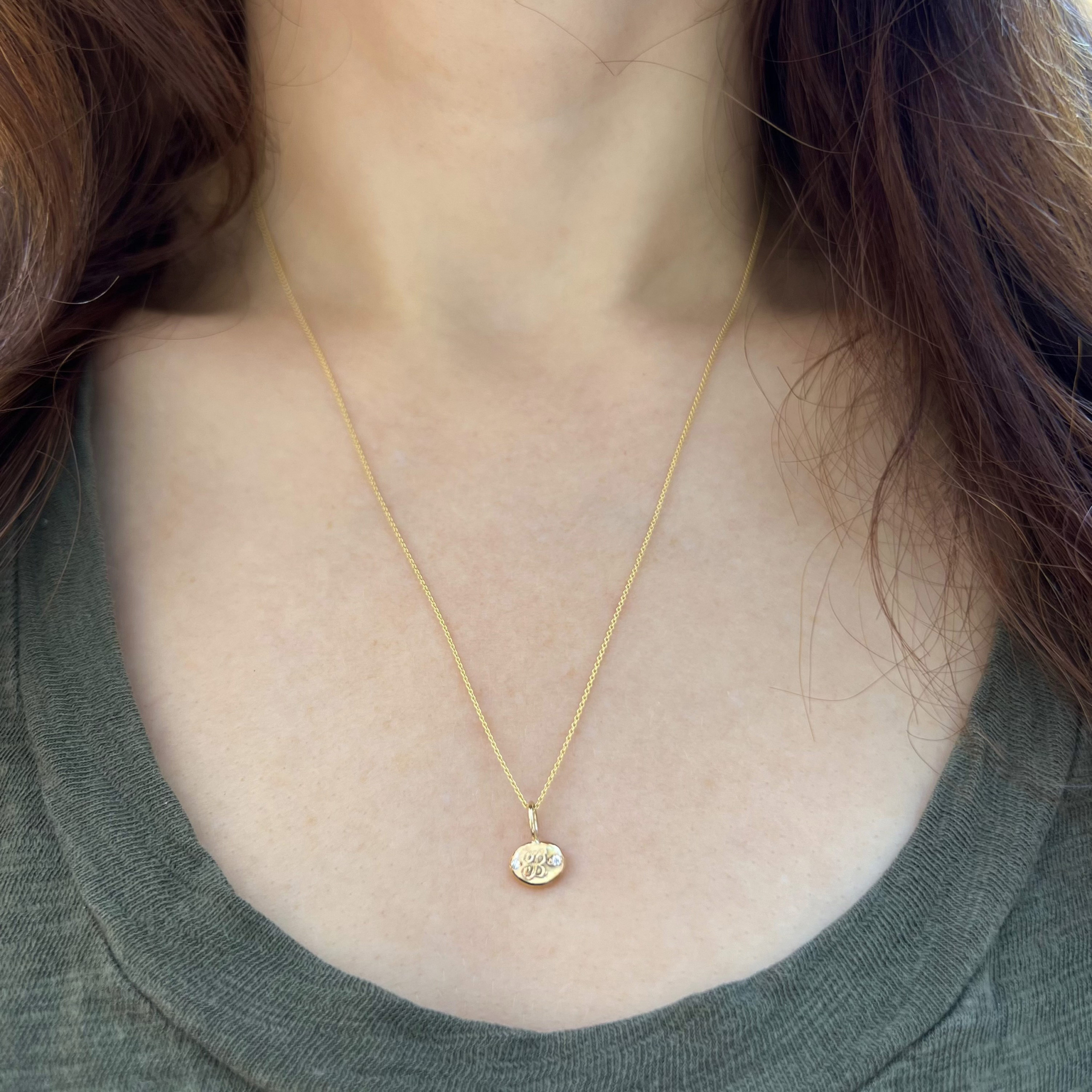 A timeless gold teeny oval charm is the perfect personalized jewel. A 1mm diamond or precious gemstone is set on either side of a hand engraved letter. One letter is available in script or block engraving. Available in 14 karat yellow, pink, or white gold. Handcrafted by Elisa.