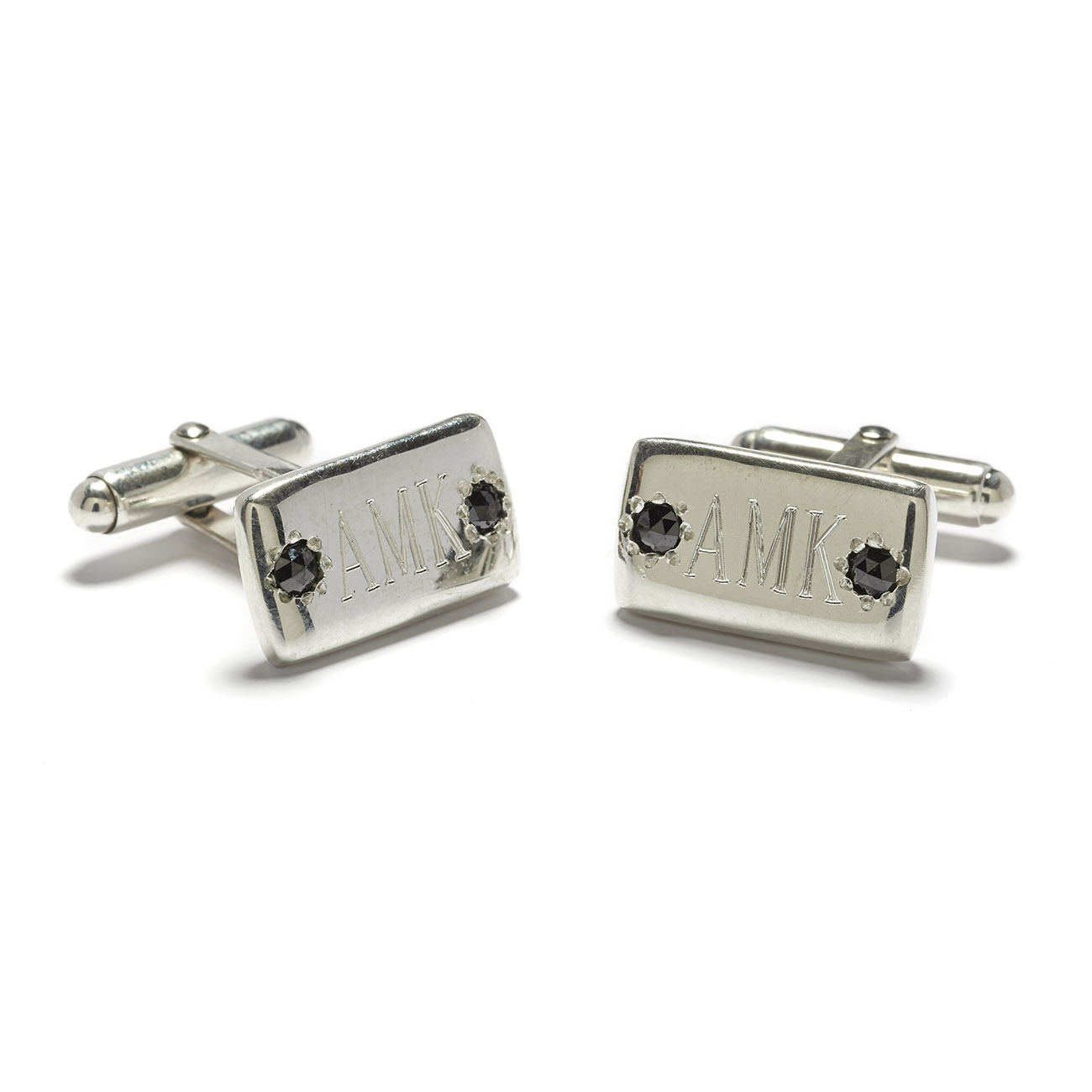 Classic, beautiful sterling silver rectangle cufflinks. Each cufflink is set with two 2mm rosecut black diamonds. Engraving is available. Handcrafted by Elisa.