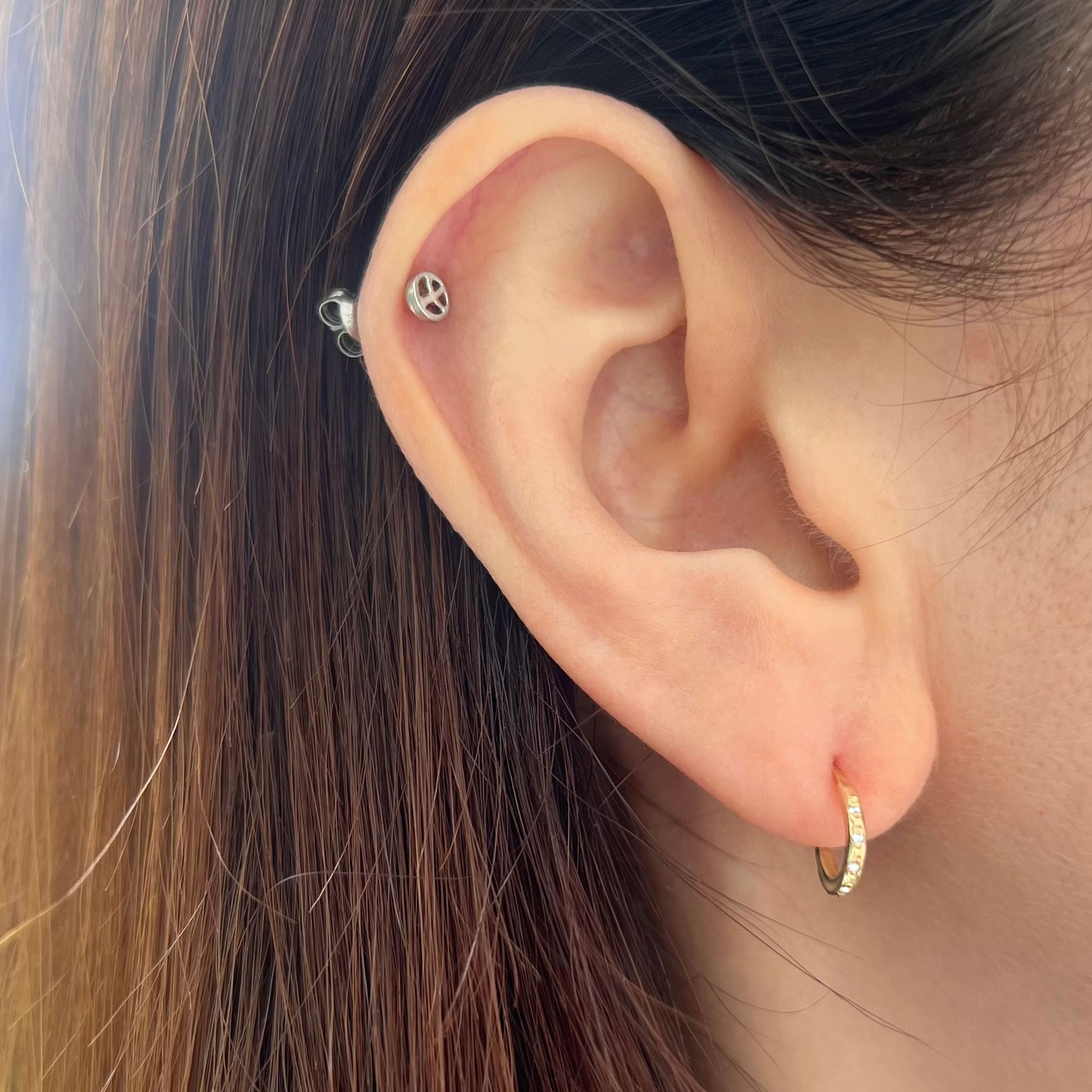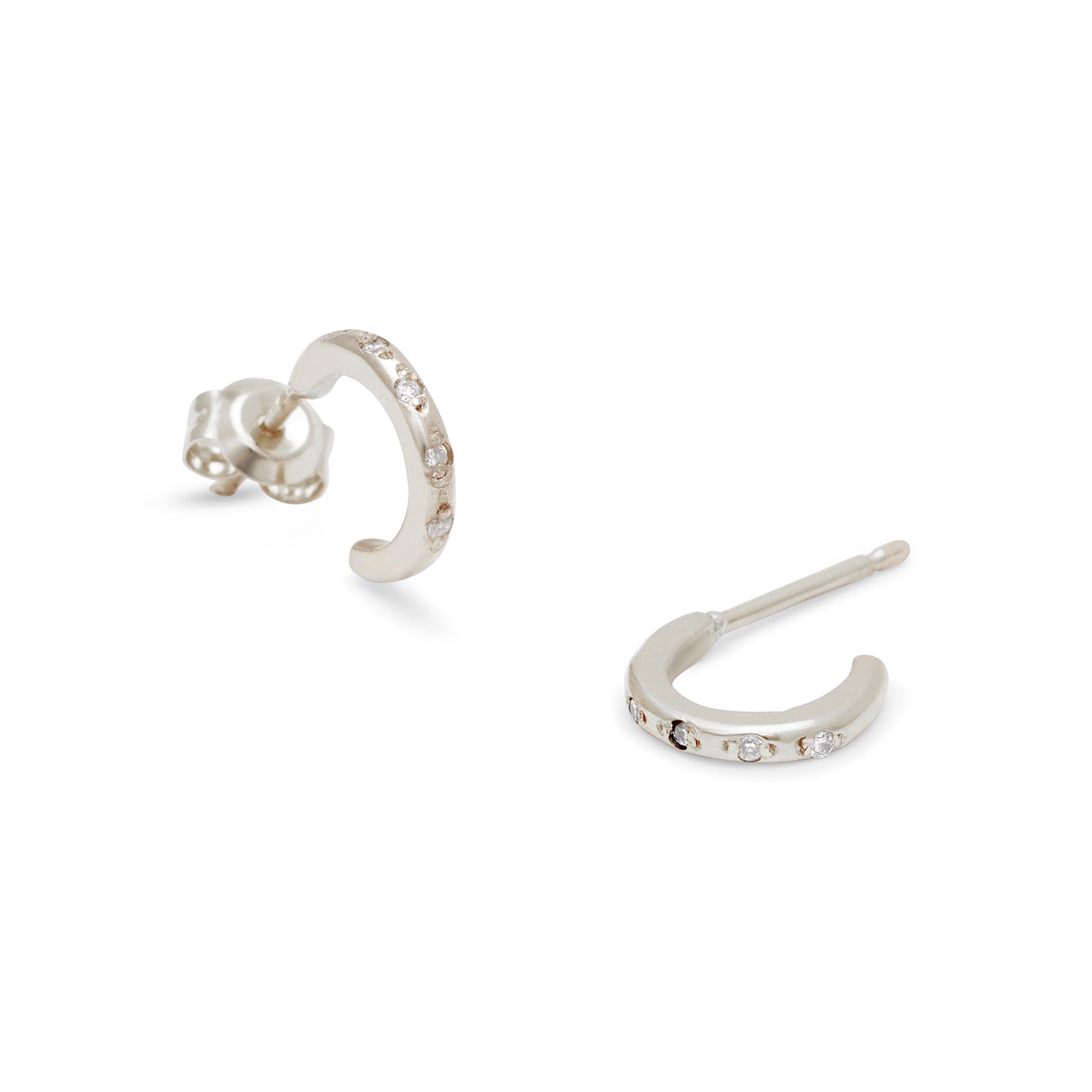 These are a classic. Tiny huggie hoop earrings featuring white diamonds. Each huggie is set with five 1mm white diamonds. Available in 14 karat yellow, pink, or white gold, or platinum. Handcrafted by Elisa.
