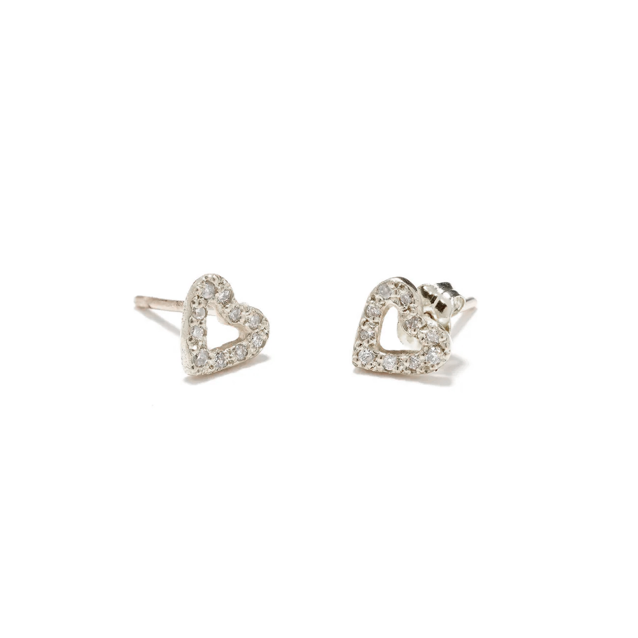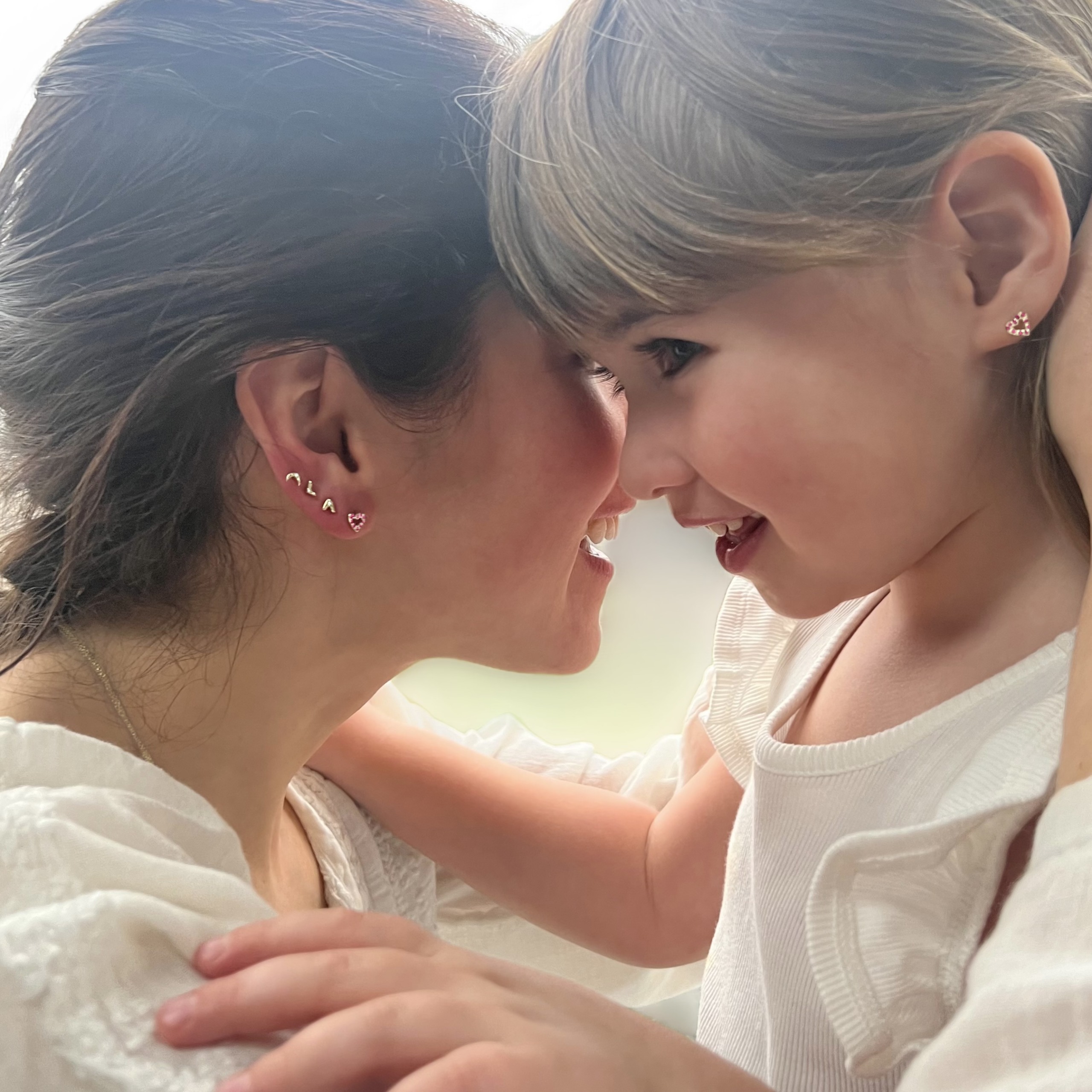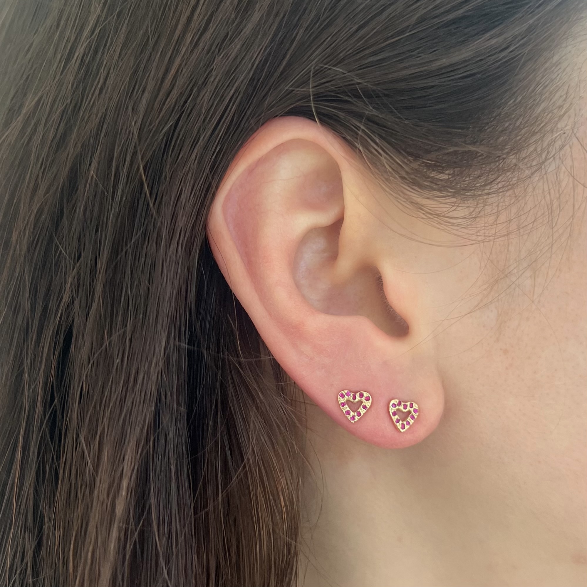 Sweet hand carved heart stud earrings are timeless, sentimental, and special. Each heart is set with 10 gemstones of your choice. These options include rainbow, multicolor, blue ombre, and pink ombre, or a meaningful birthstone. The 14 karat gold heart studs are available in yellow, pink, or white gold. Handcrafted by Elisa.