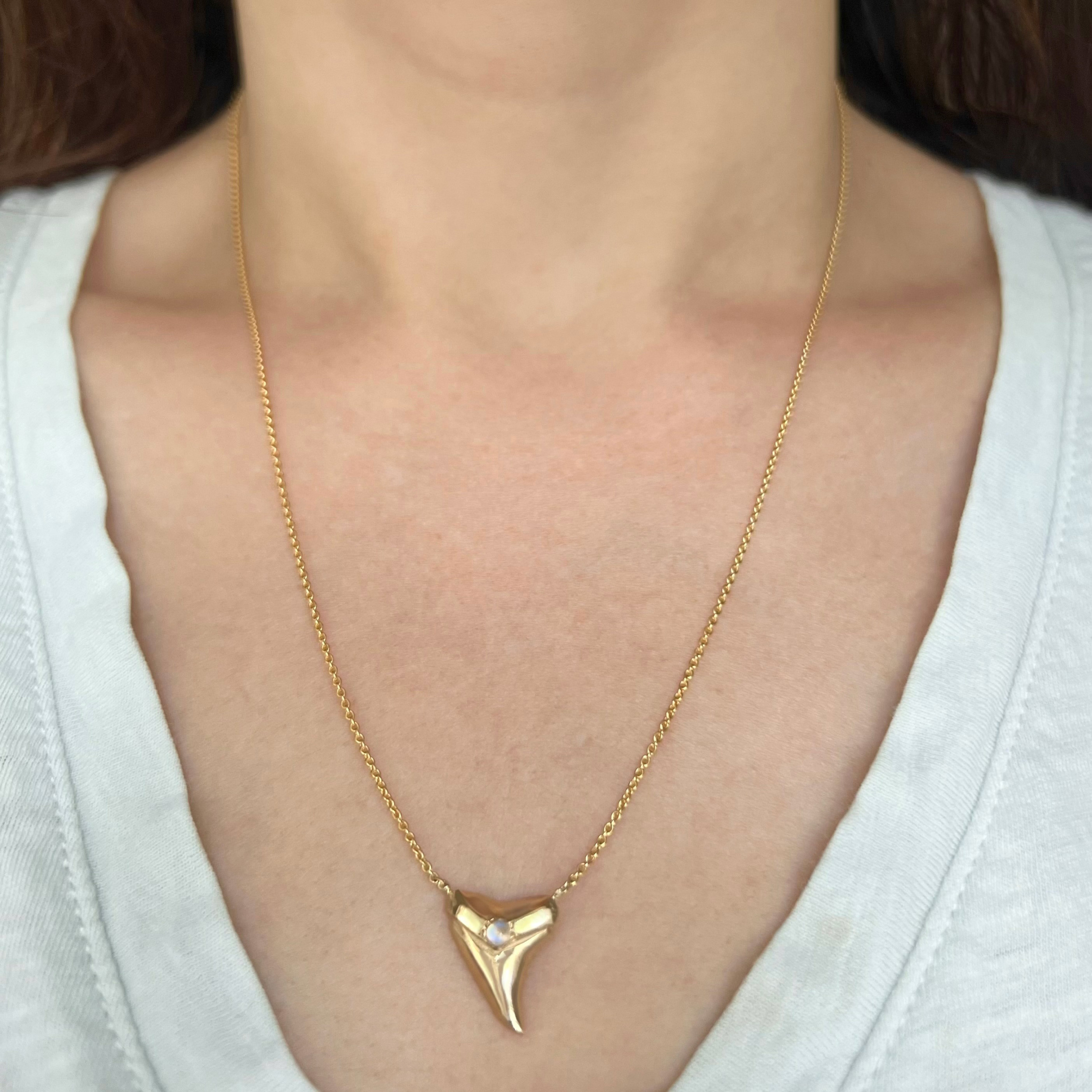 Inspired by the beach, this 14 karat gold shark tooth necklace is set with a precious gemstone cabochon or rosecut white diamond. The back is hand engraved. Available in yellow, pink, or white gold. Handcrafted by Elisa.