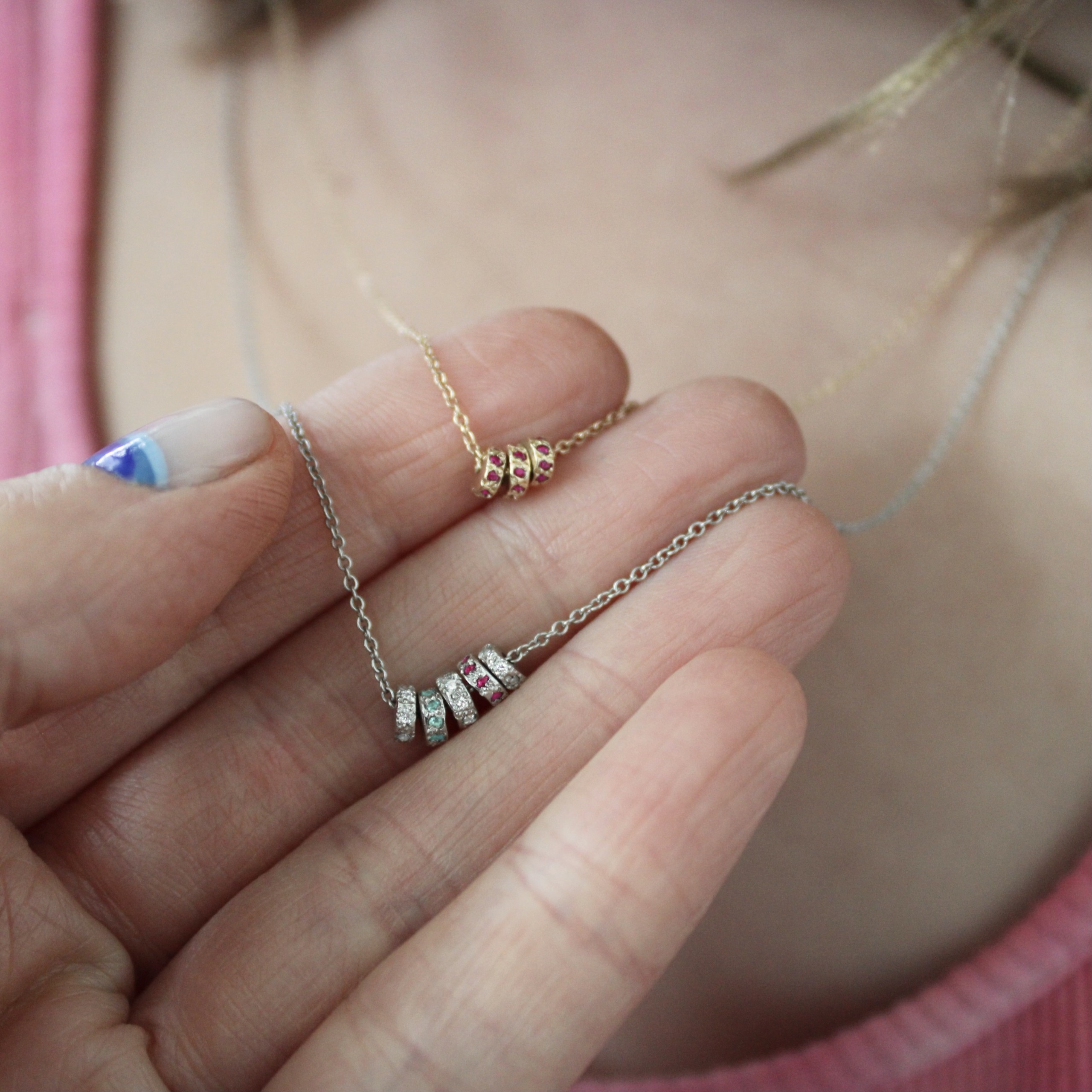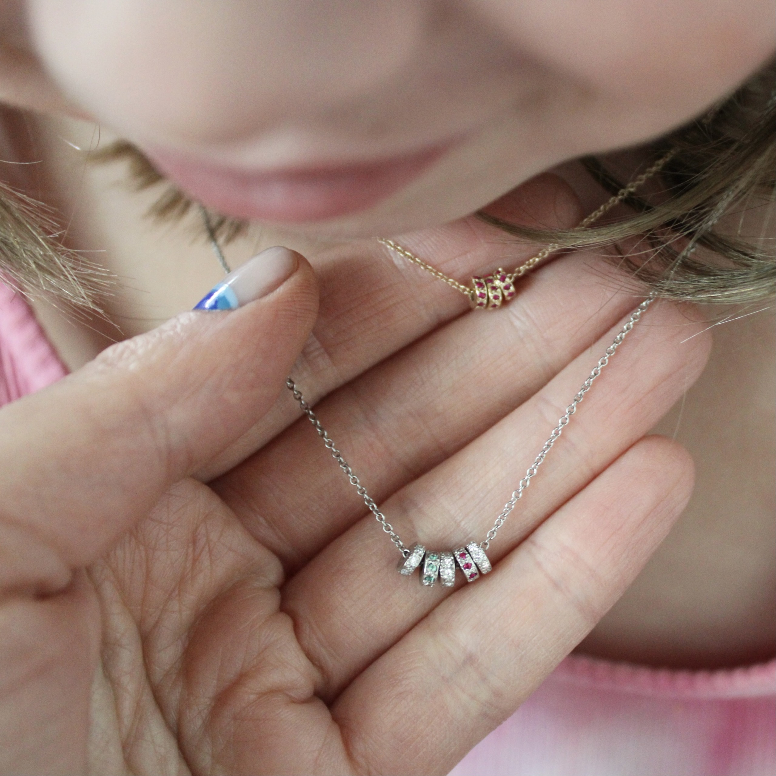 A classic bead necklace personalized with a medley of gemstones. The three beads can be customized with white diamond, blue sapphire, emerald, ruby, or alexandrite. Nine stones are set in each tiny bead. This tiny bead necklace is available in 14 karat yellow, pink, or white gold, or platinum. Handcrafted by Elisa.