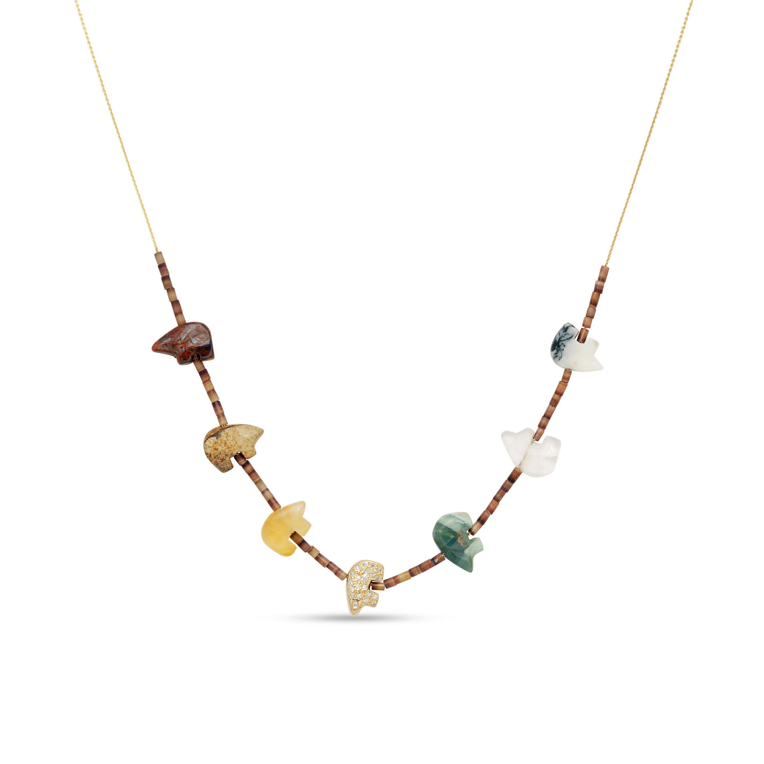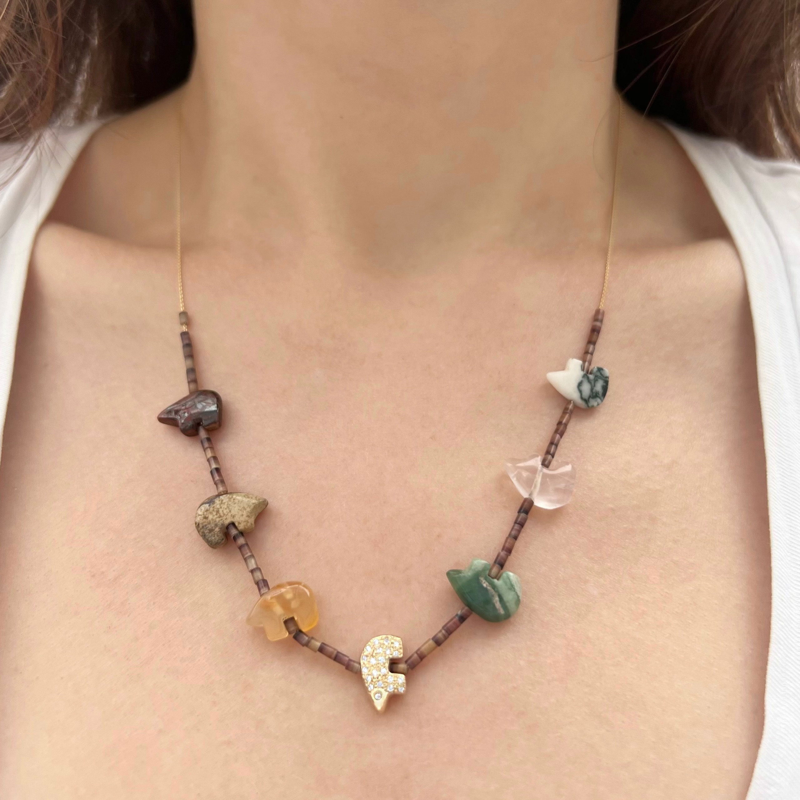 Bohemian cool and one of a kind. The 14 karat yellow gold bear bead necklace is strung with gemstone bear beads and shell heshi beads. The single gold bear is set with twenty-one 1mm white diamonds. Handcrafted by Elisa.