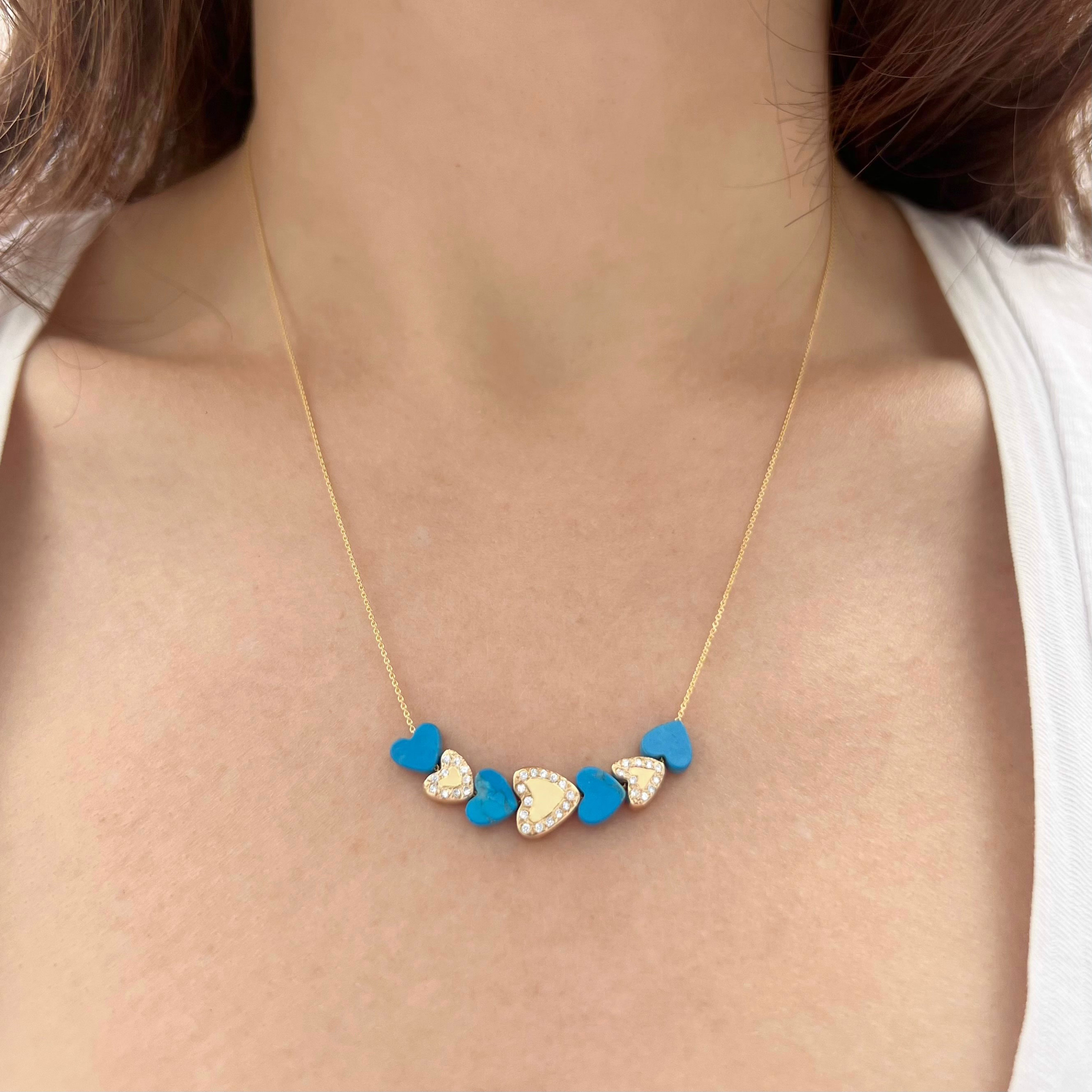 Bohemian cool. This 14 karat yellow gold heart beads necklace is strung with four turquoise heart beads. The large gold heart is set with fourteen 1mm white diamonds. The two small gold hearts are each set with ten 1mm white diamonds. Handcrafted by Elisa.