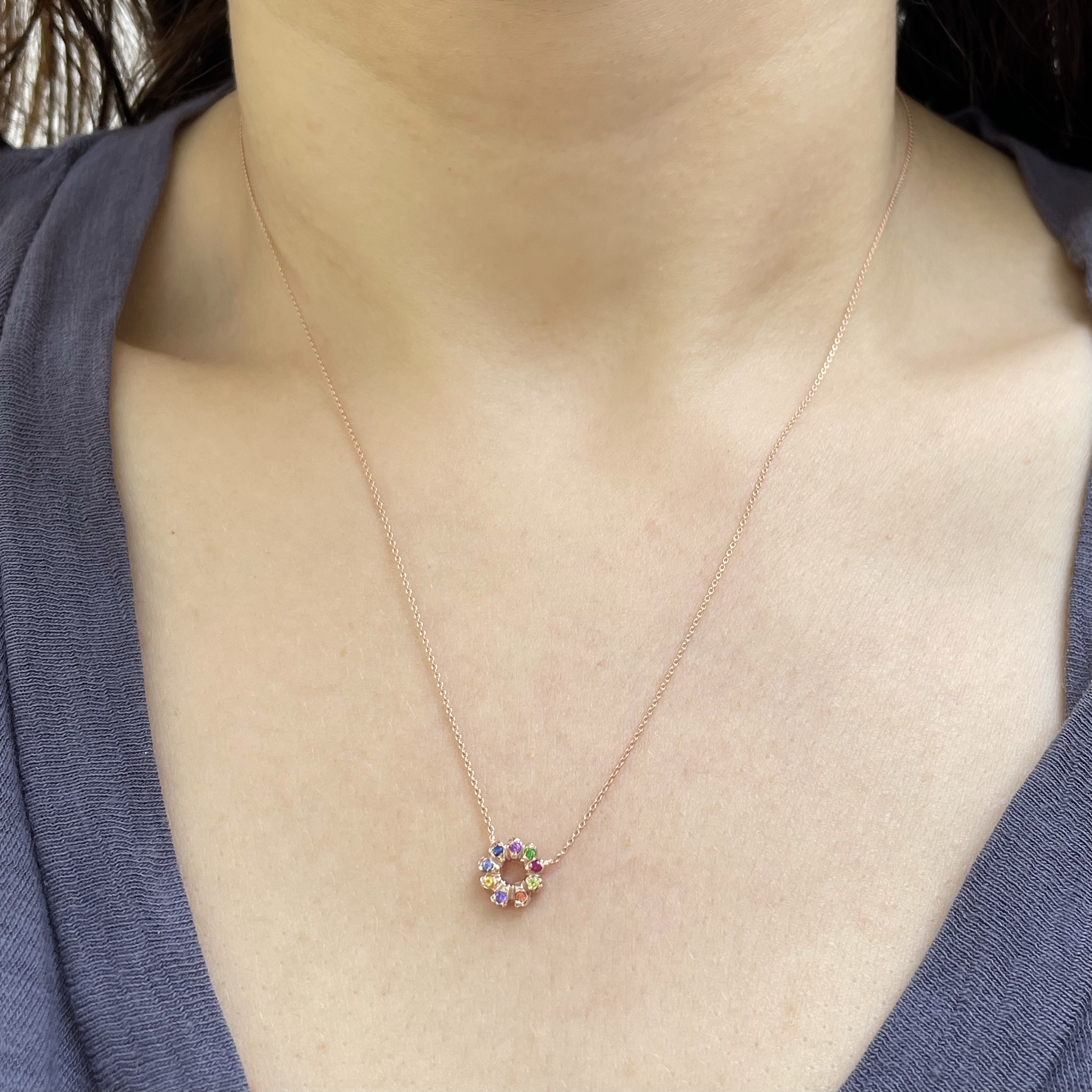 A classic, signature necklace. This 14 karat pink gold flower child necklace is set with 9 multicolor gems. These include red sapphire, garnet, citrine, tsavorite, blue sapphire, iolite, amethyst, rhodolite, and pink sapphire. Handcrafted by Elisa.