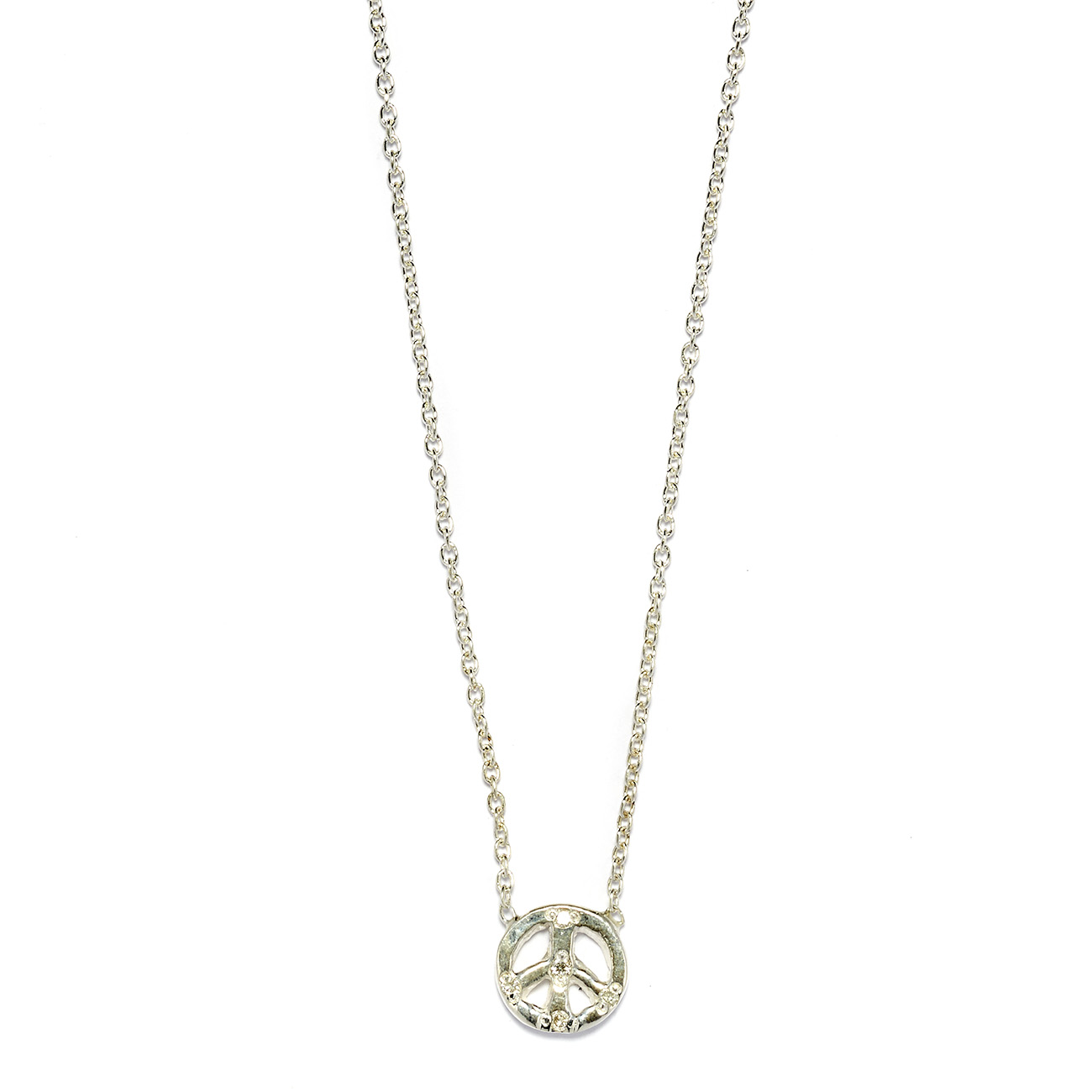 The peace sign necklace is a signature in the collection. This sterling silver tiny peace sign necklace features five 1mm white diamonds. Handcrafted by Elisa.