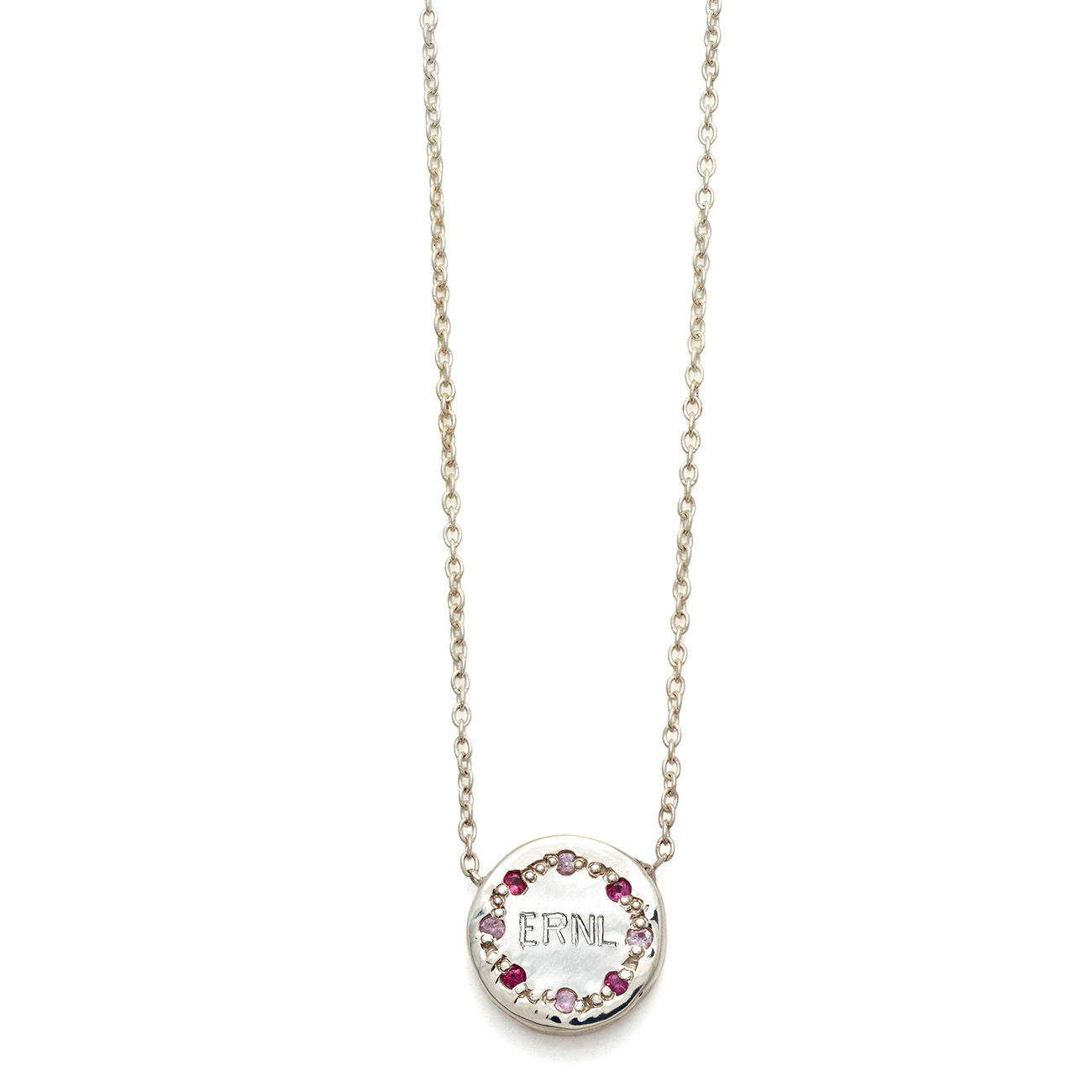 This necklace is the perfect personalized piece. The sterling silver circle is set with 1mm light and dark pink sapphire gems. The center can be engraved with your or your loved one’s initial. A sentimental, special necklace. Handcrafted by Elisa.