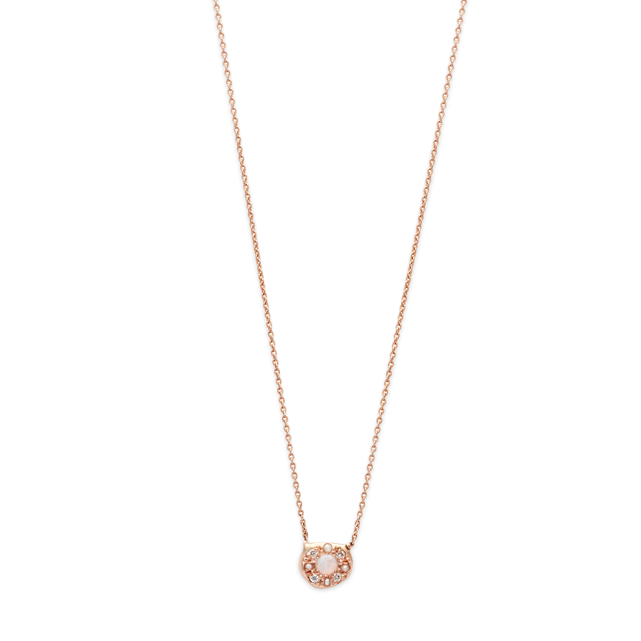 This classic 14 karat pink gold necklace features an opal cabochon surrounded by pearls and 1mm white diamonds. Handcrafted by Elisa.