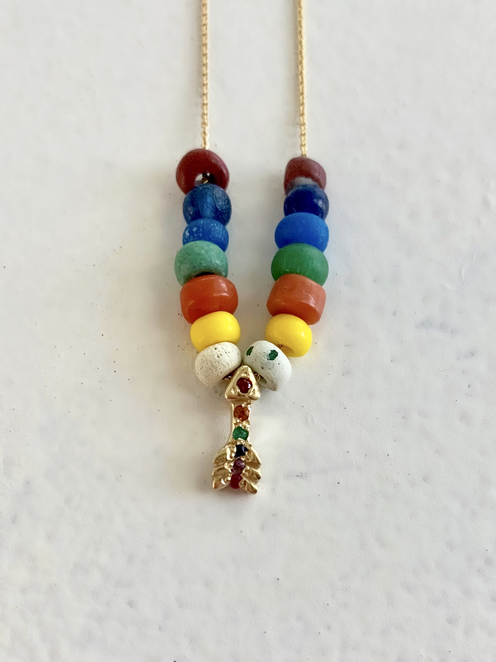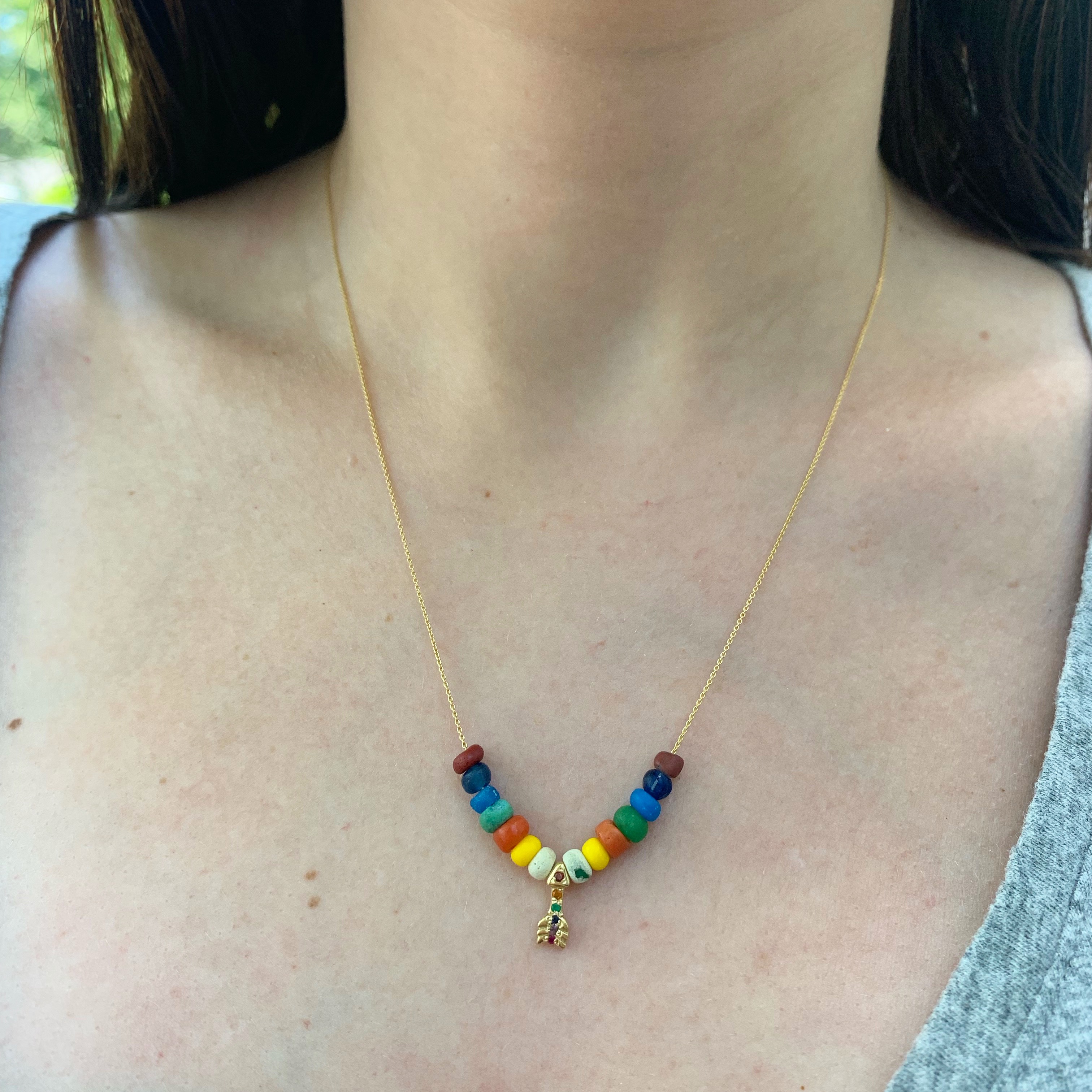 Bohemian cool. The 14 karat yellow gold rainbow arrow necklace is strung with rainbow ancient beads. The arrow is set with garnet, citrine, tsavorite, blue sapphire, amethyst, and pink sapphire. 17 inches. Handcrafted by Elisa.
