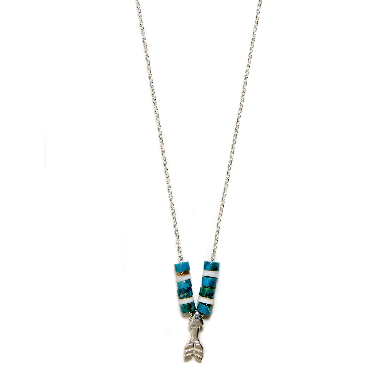 Bohemian cool. The sterling silver arrow necklace is strung with turquoise and shell heshi beads. Handcrafted by Elisa.