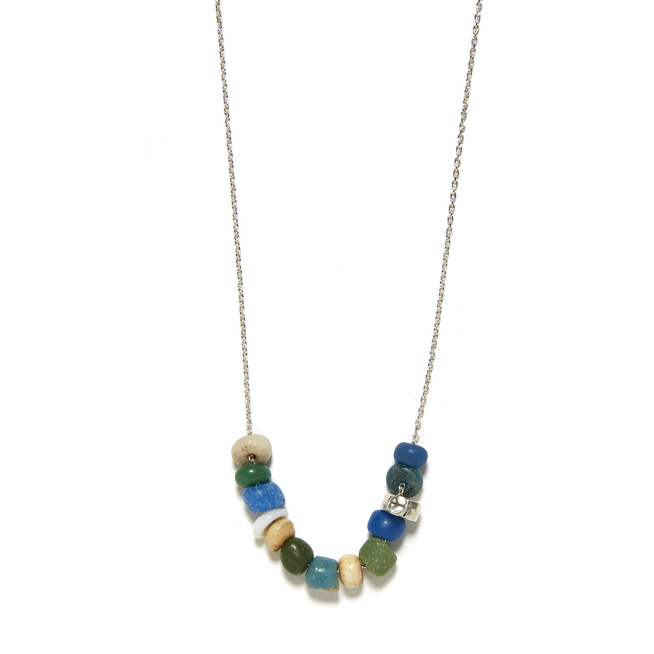 Bohemian cool. The sterling silver peace bead necklace is strung with green and blue hued ancient glass and stone beads. Handcrafted by Elisa.