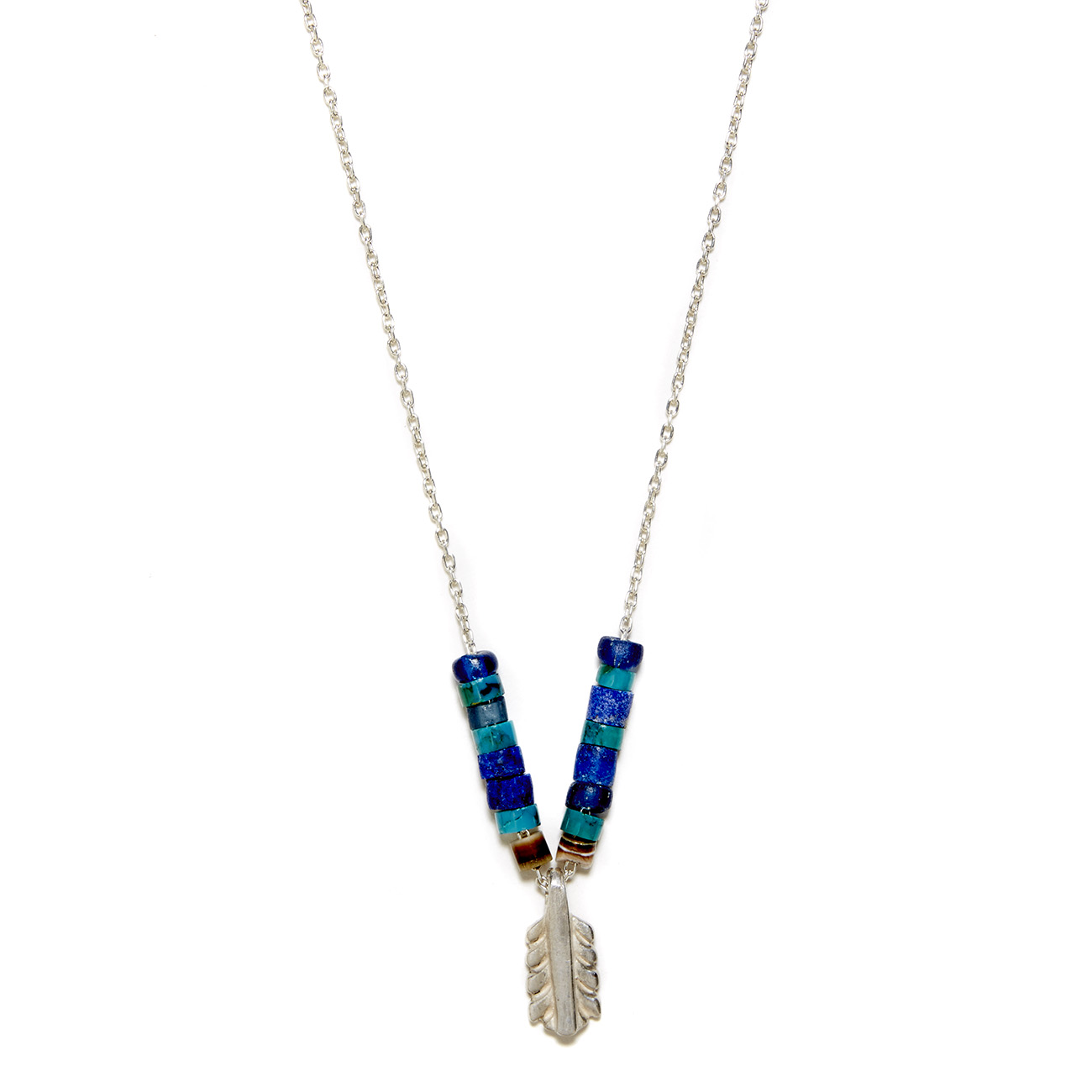 Bohemian cool. The sterling silver small feather necklace is strung with turquoise, lapis, and shell heshi beads. Handcrafted by Elisa.
