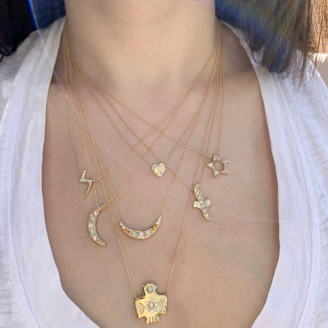 The hand carved 14 karat yellow gold lightning bolt necklace is set with five 1mm white diamonds. Handcrafted by Elisa.