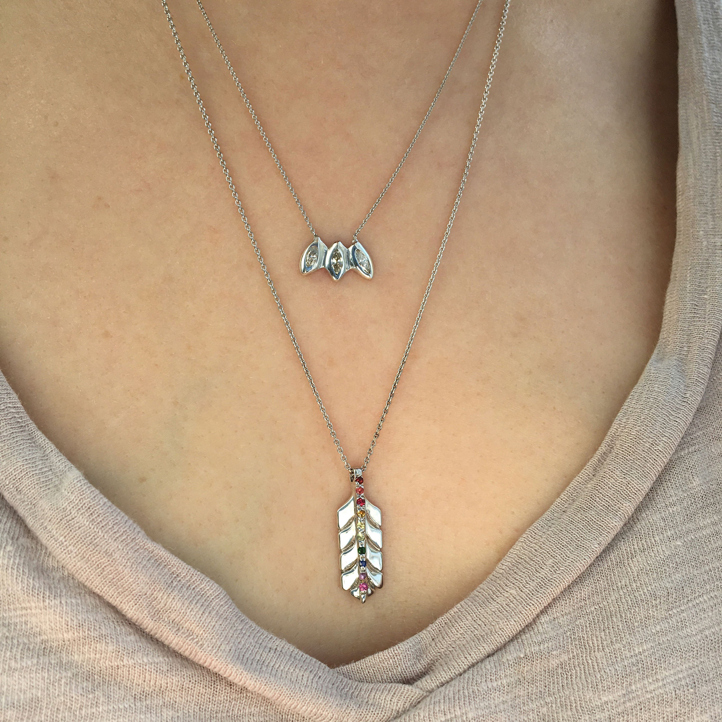 This 14 karat white gold feather necklace is set with rainbow gems including garnet, red sapphire, citrine, yellow sapphire, peridot, tsavorite, blue sapphire, amethyst, rhodolite, pink sapphire. Handcrafted by Elisa.