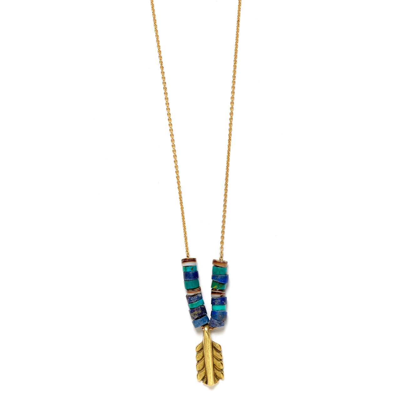 Bohemian cool. The 14 karat yellow gold small feather necklace is strung with turquoise, lapis, and shell heshi beads. Handcrafted by Elisa.