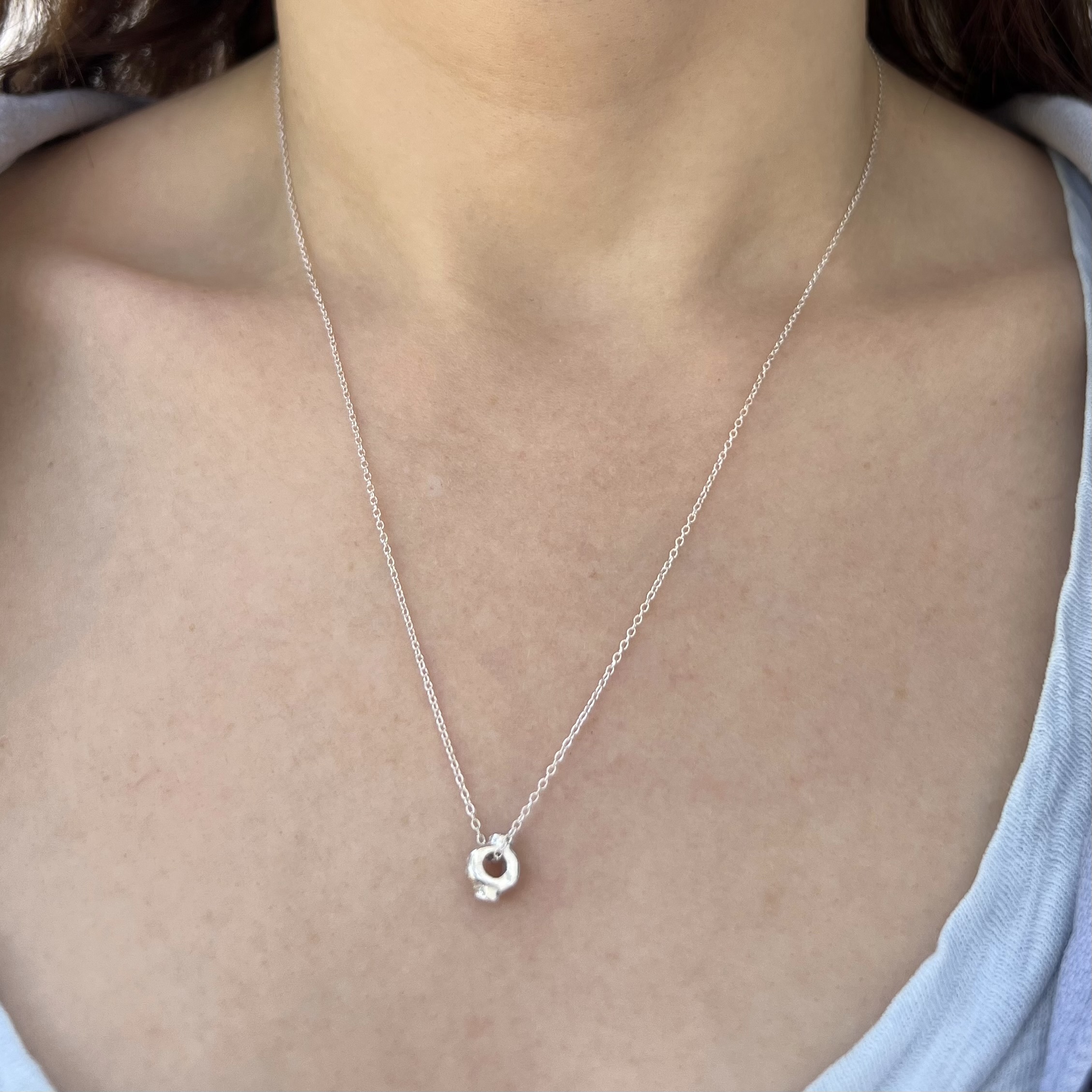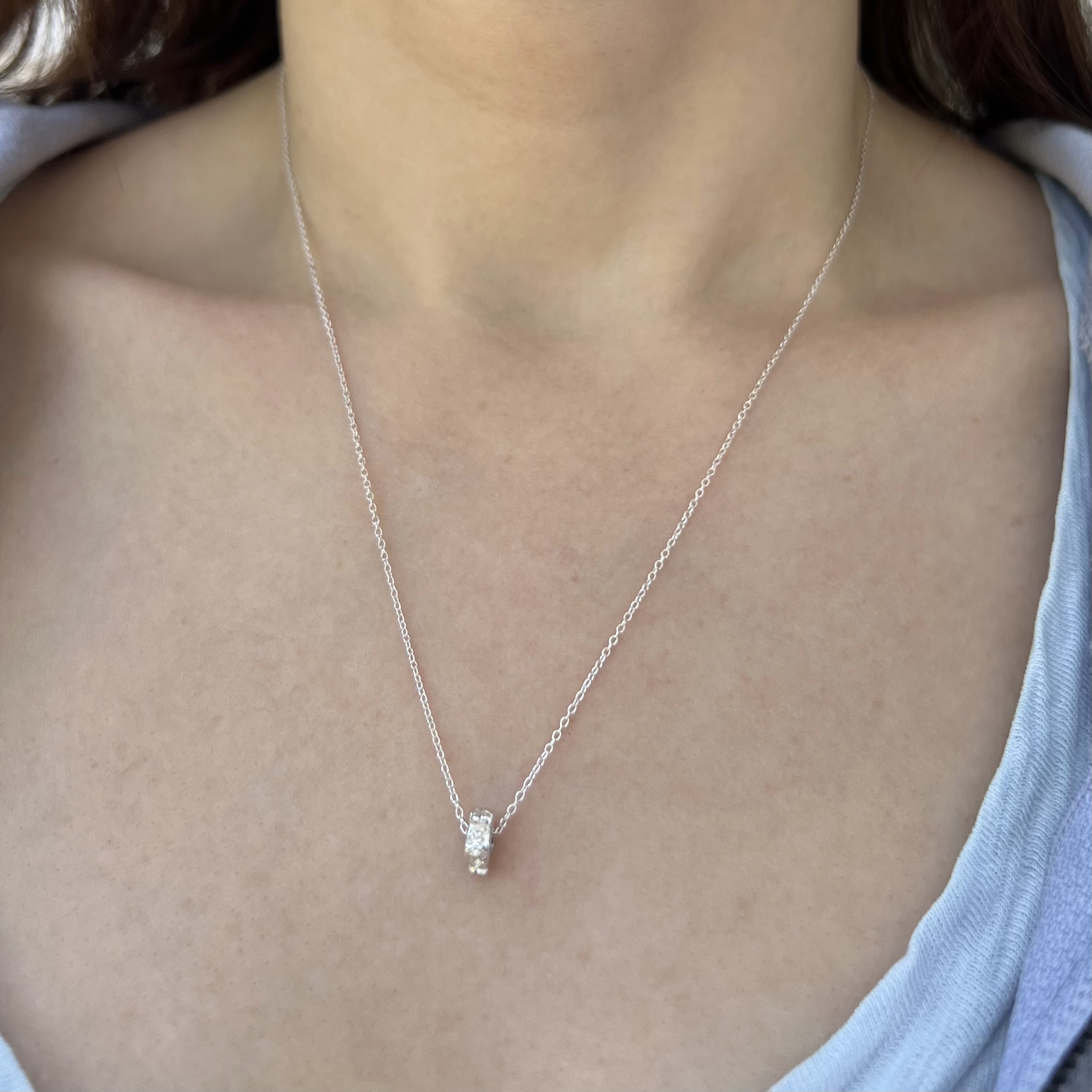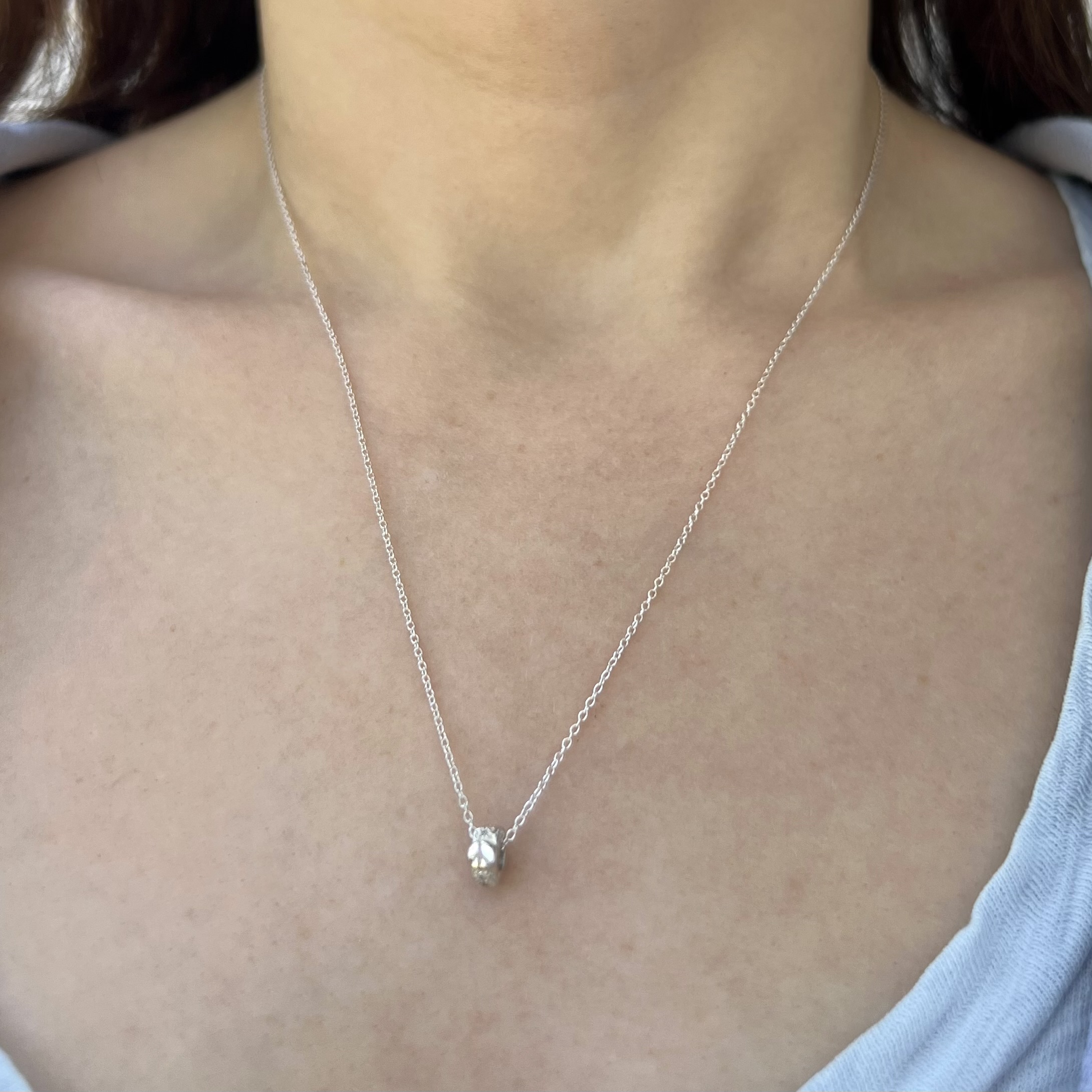 The sterling silver peace bead necklace is set with 8 white diamonds. The bead is carved with 2 classic peace signs. Four diamonds are set between each peace symbol. A sweet pendant and a beautiful jewel to wear daily. The peace bead can slide along the chain. 17 inch chain included. Handcrafted by Elisa.