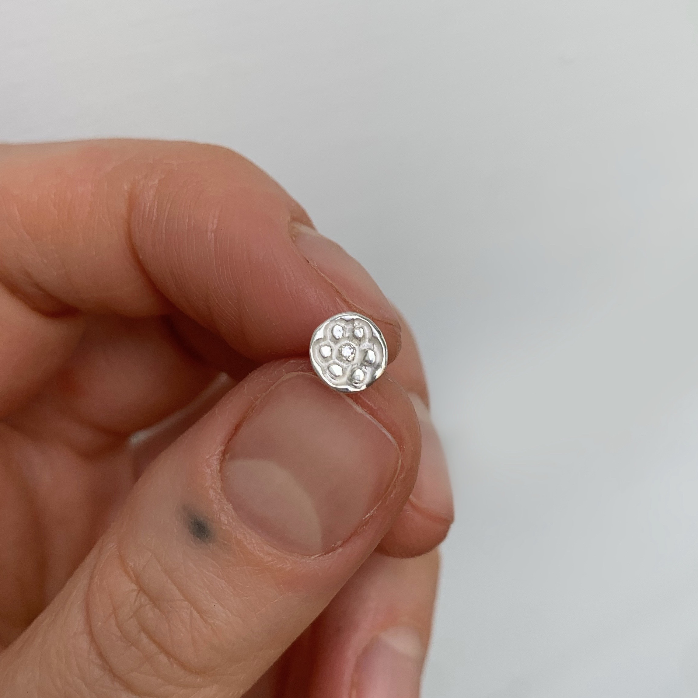 The sterling silver single flower disk stud earring is set with a 1mm white diamond. A classic jewel to wear daily. Handcrafted by Elisa.