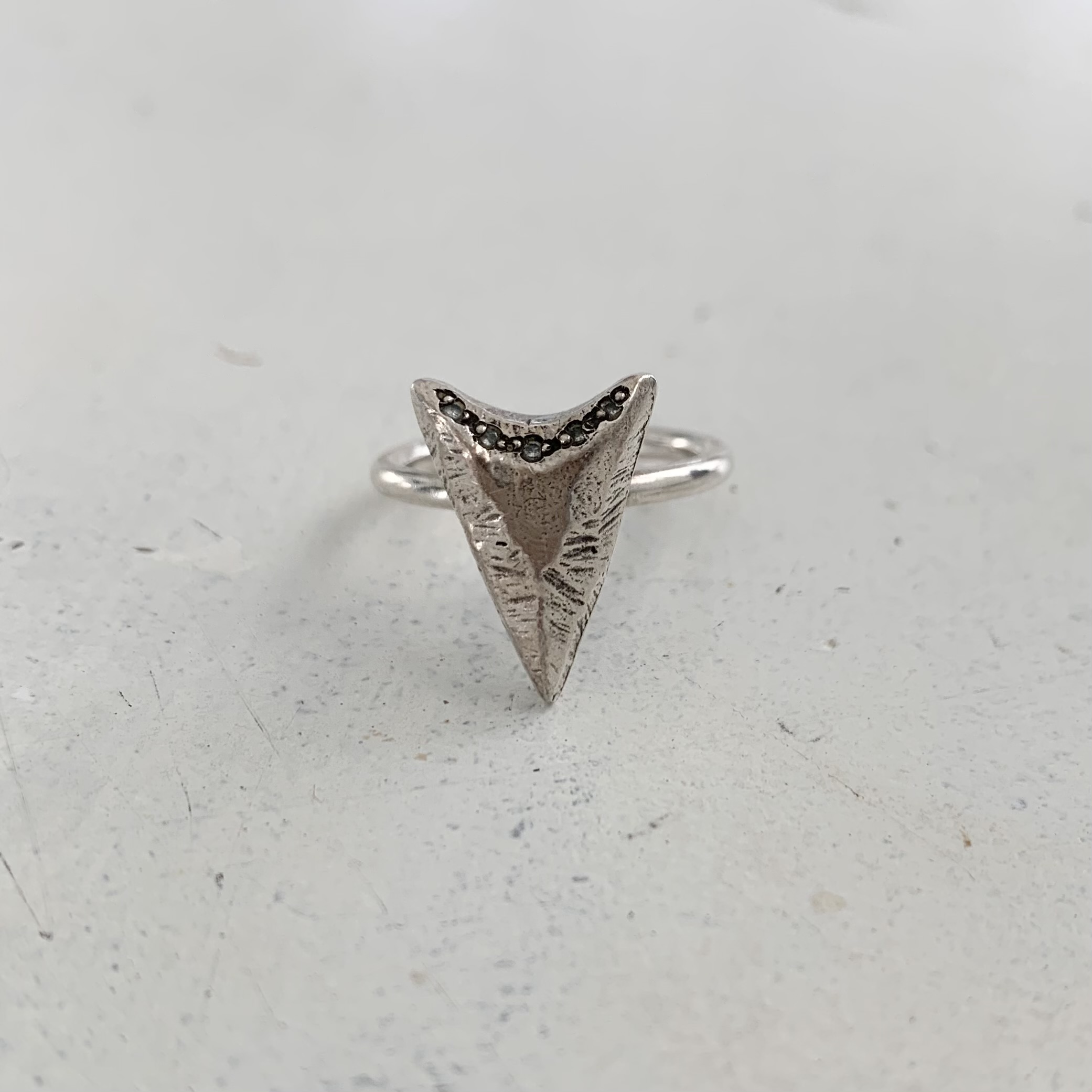 This blackened sterling silver arrowhead ring is set with five 1mm black diamonds. Size is between 4 1/4-4 1/2. Handcrafted by Elisa.