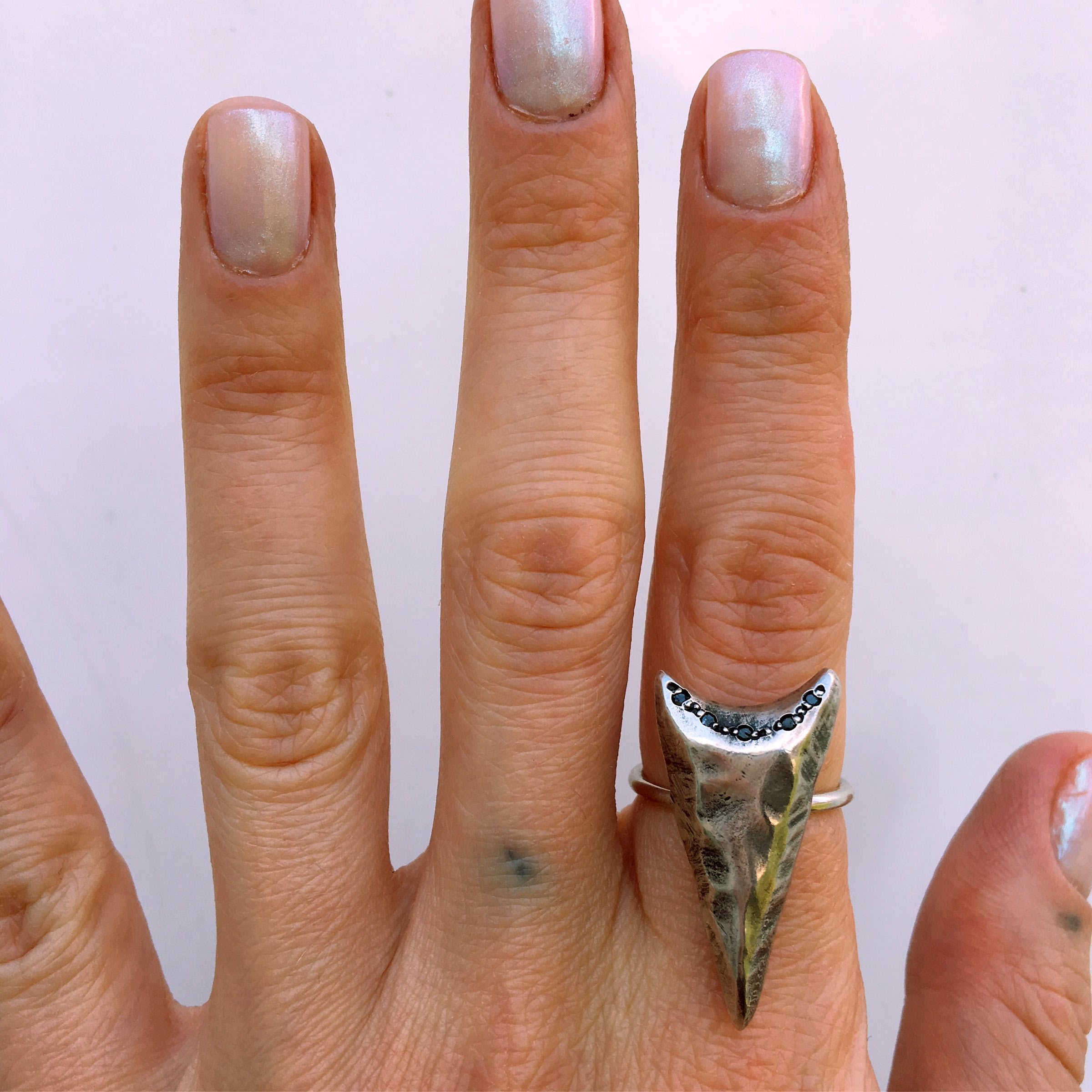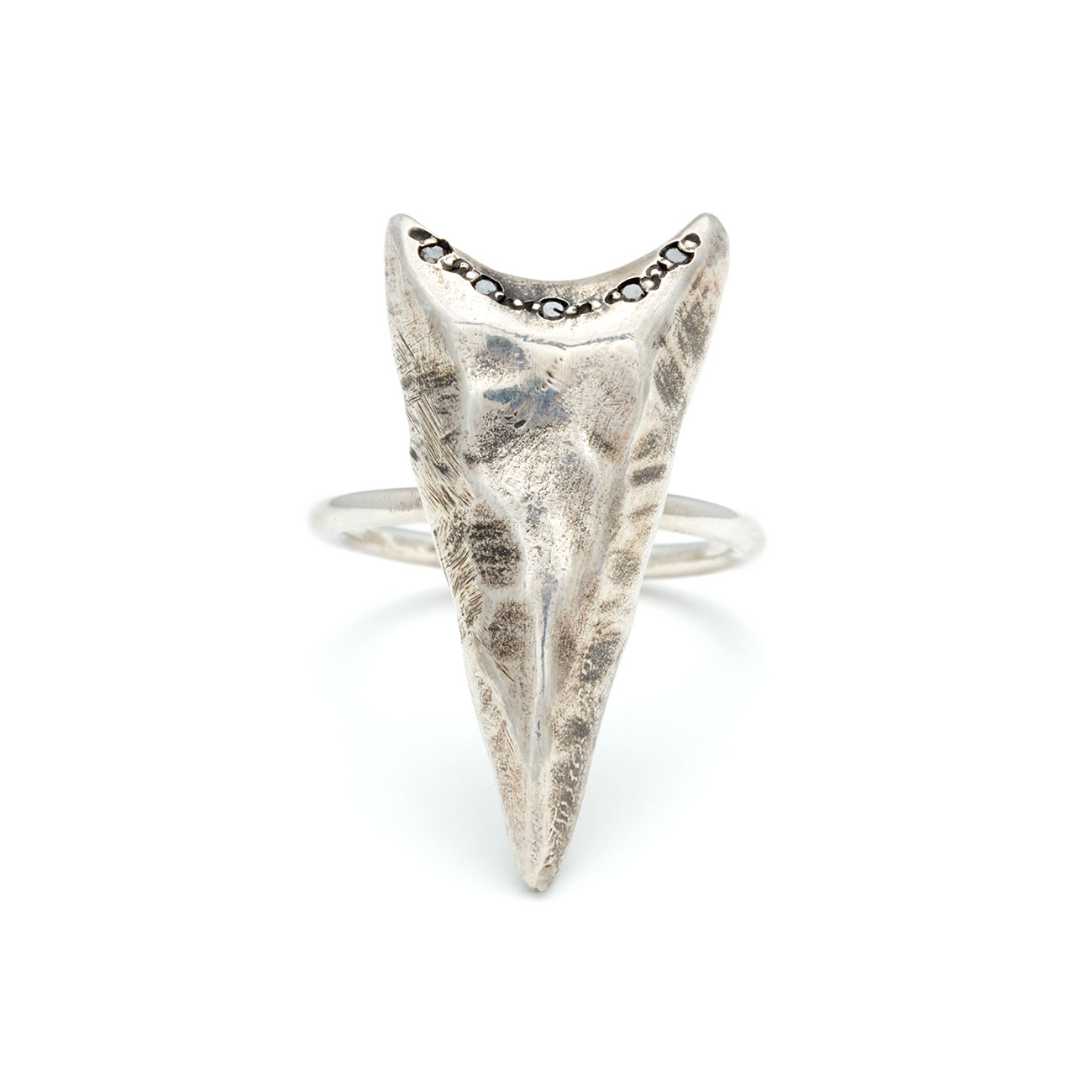 This blackened sterling silver arrowhead ring is set with five 1mm black diamonds. Handcrafted by Elisa.