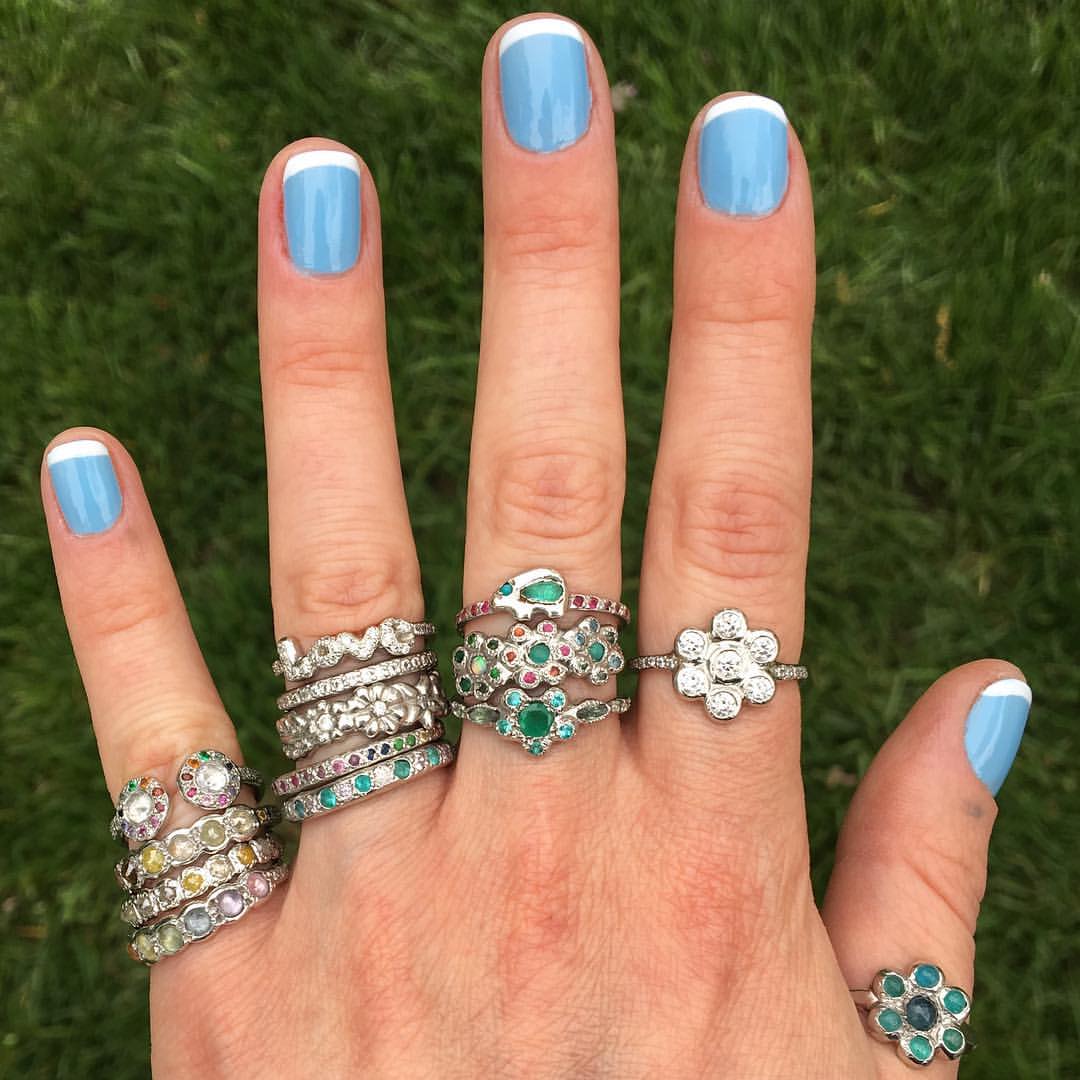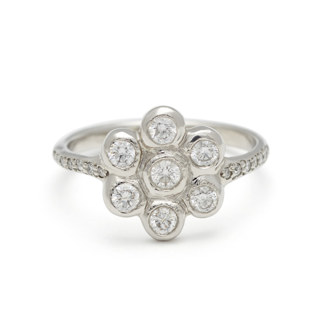 This platinum ring is set with seven round white diamonds. The classic flower motif is stunning and sparkly. Handcrafted by Elisa.