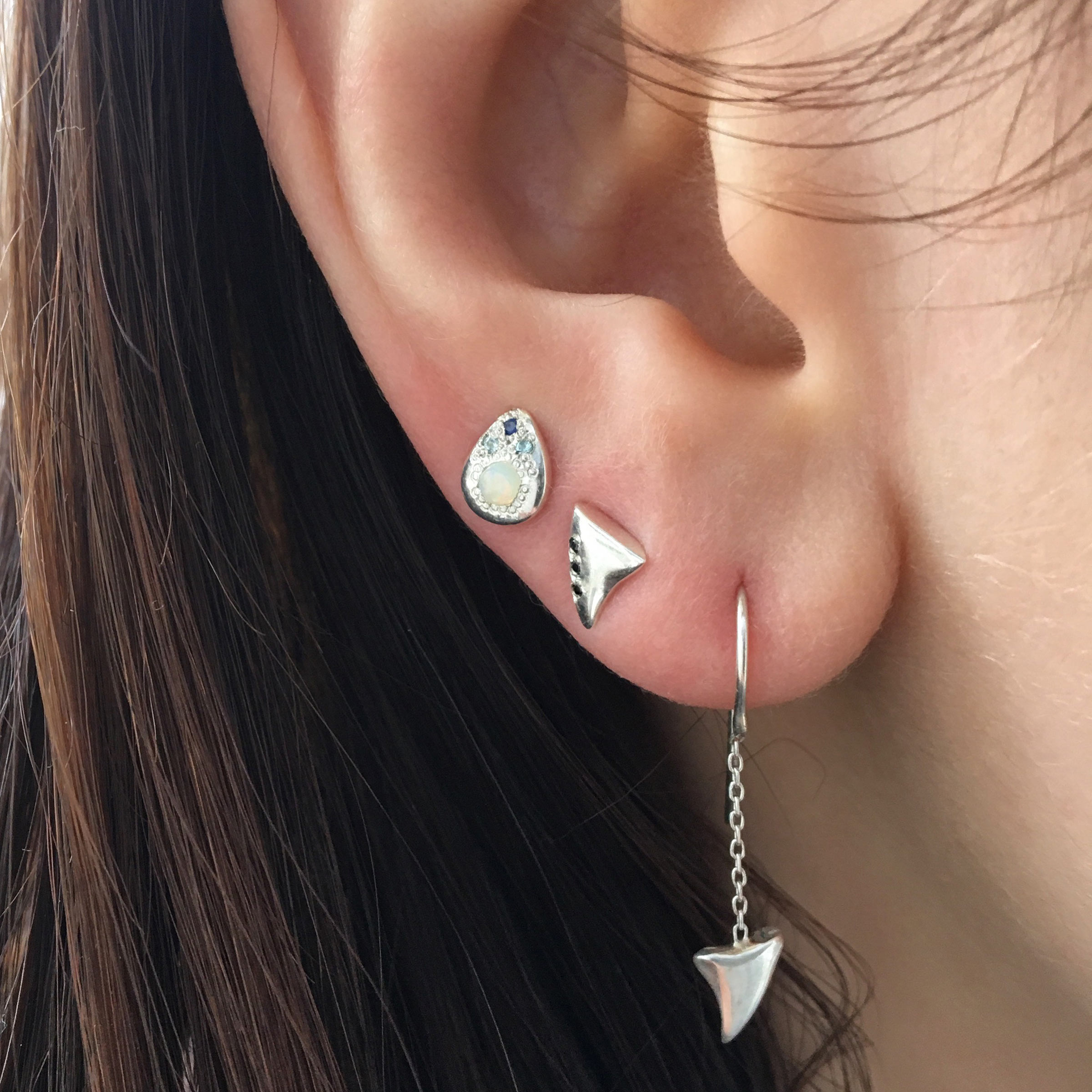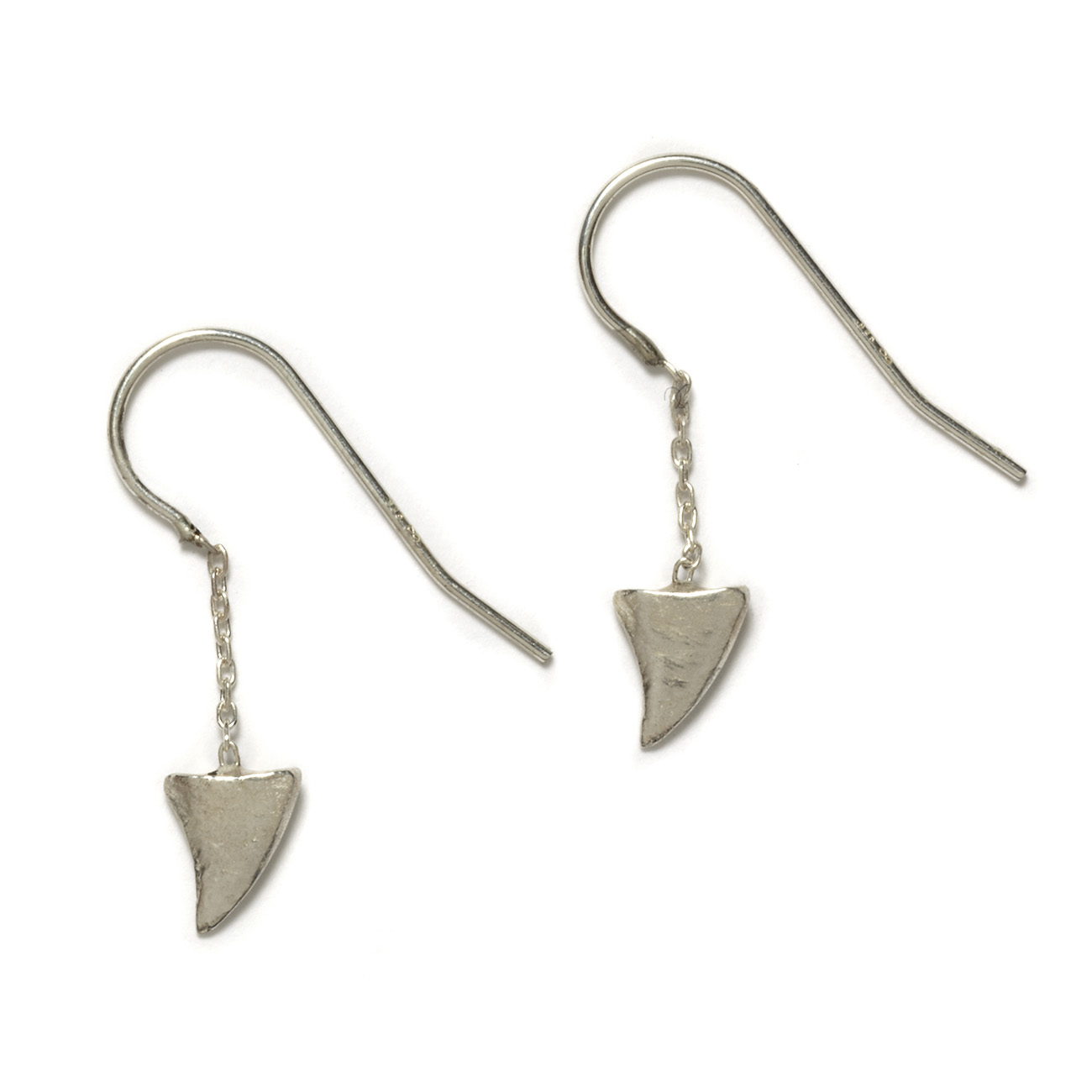 Cool, beach inspired sterling silver baby shark tooth dangling earrings. Handcrafted by Elisa.