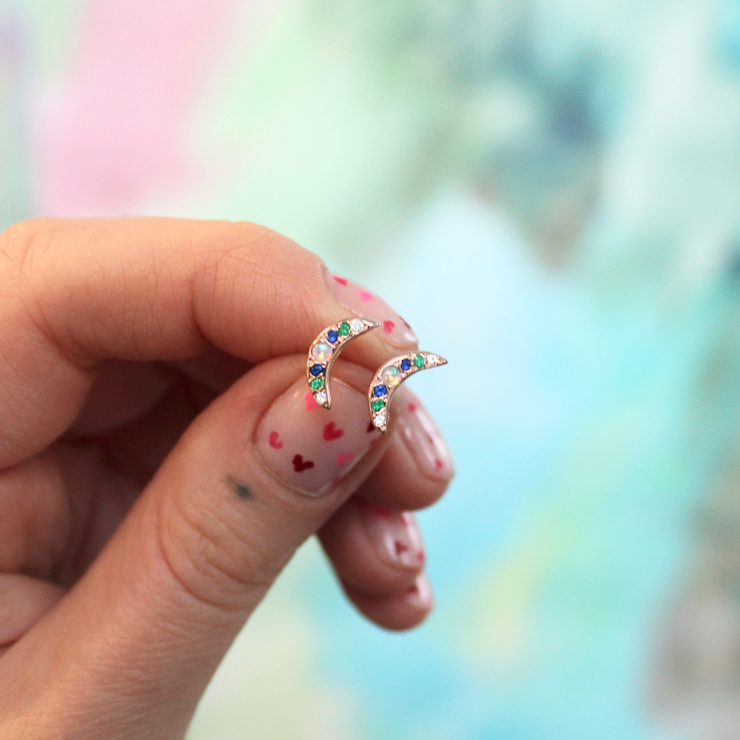 A celestial favorite customized with a medley of gemstones. The perfect gift, select your favorite gems or meaningful birthstones. These 14 karat gold mini moon studs are available in yellow, pink, or white gold. The center is set with a precious gemstone cabochon or rosecut white diamond. Three 1mm precious gemstones or white diamonds are set on either side of the center stone. Handcrafted by Elisa.