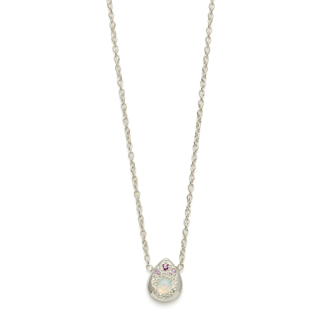 Beautiful sterling silver pear necklace set with an opal cabochon and 1mm light and dark pink sapphire gems. Handcrafted by Elisa.