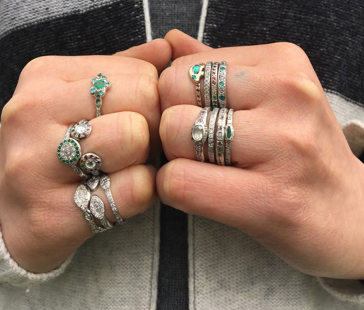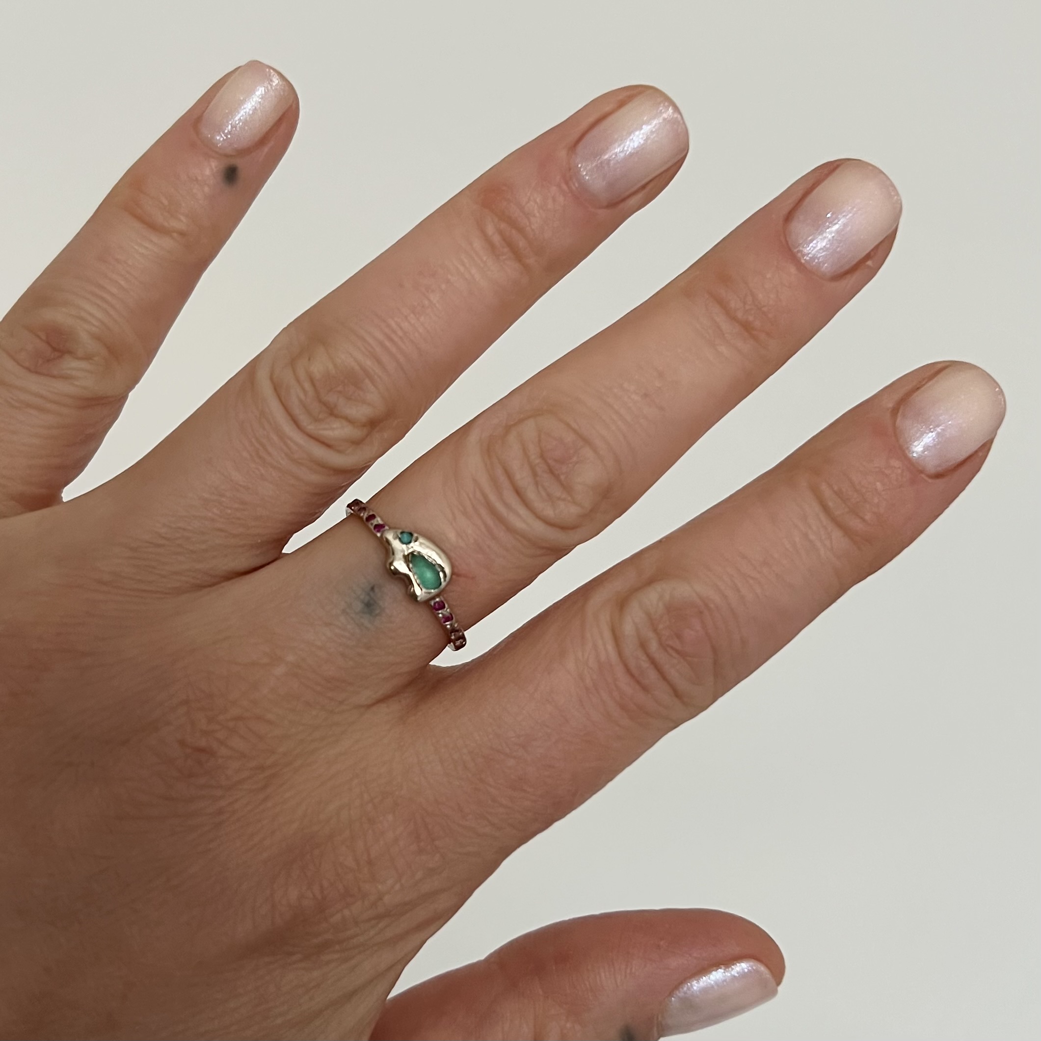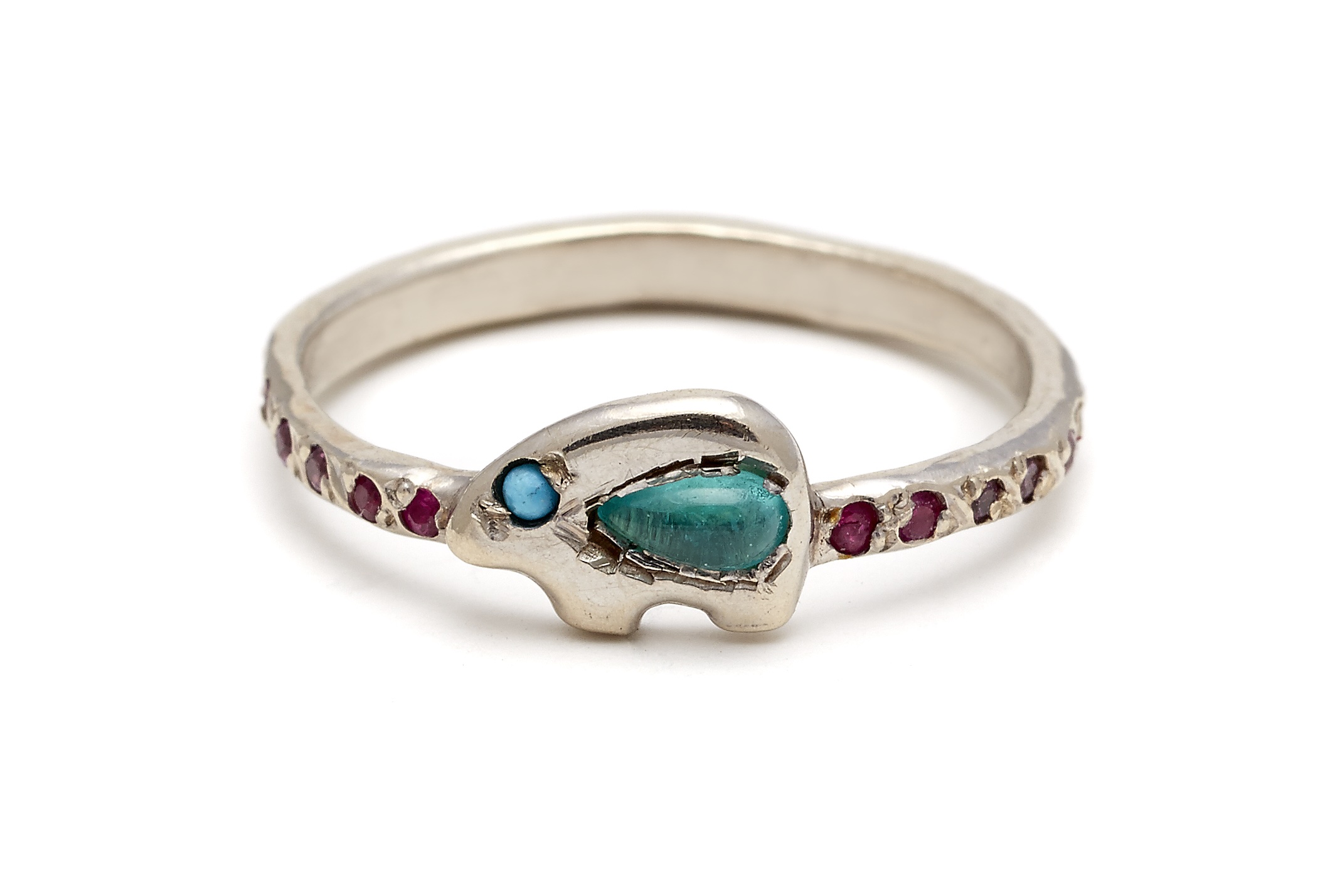 A precious ring with a rare stone center. The 14 karat white gold bear ring is set with a pear-shaped Brazilian paraiba tourmaline and a turquoise eye. The shank is set with multicolor gems including red sapphire, pink sapphire, blue sapphire, iolite, garnet, tsavorite, and amethyst. Size 6.5-6.75. Handcrafted by Elisa.