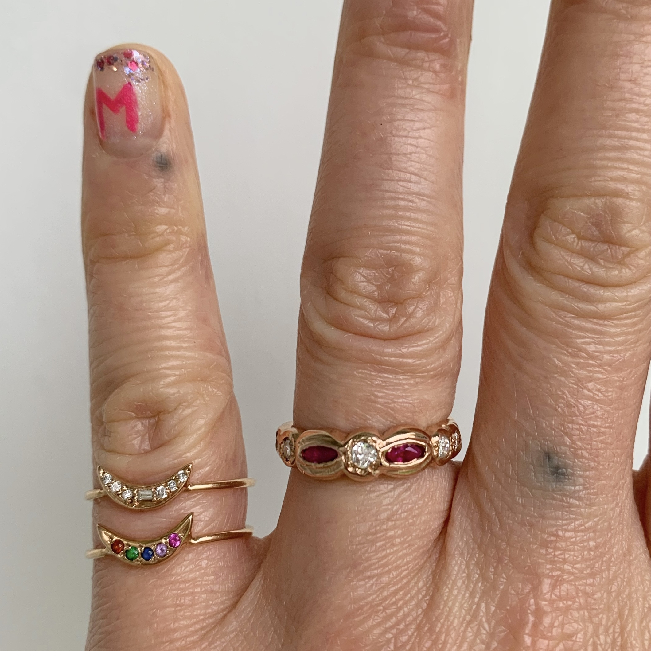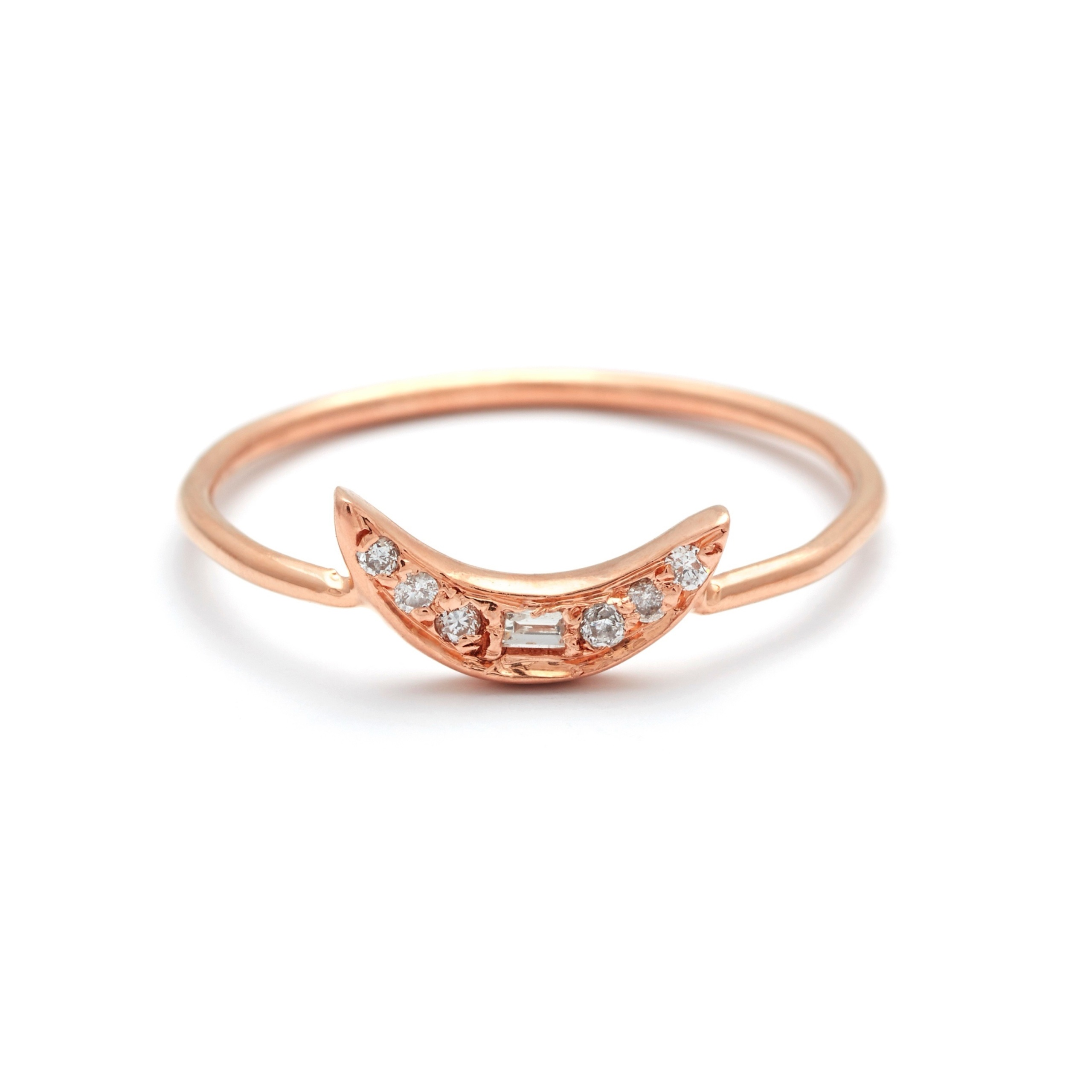 Celestial 14 karat pink gold mini moon ring set with a white diamond baguette and six 1mm white diamonds. Size 5.25. Handcrafted by Elisa.