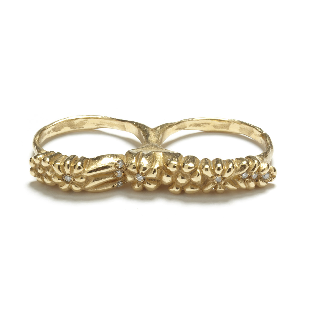This 14 karat yellow gold two finger flower ring is unique because of the way it rests on your hand. The flowers and leaves are set with 1mm white diamonds. Handcrafted by Elisa.