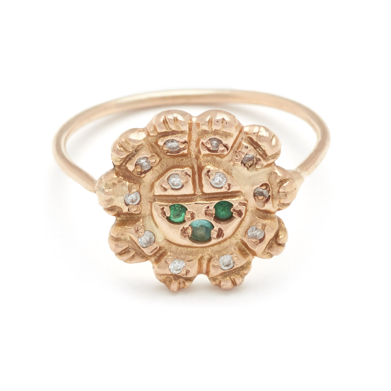 The sun spirit symbolizes life, growth, strength, and abundance. This 14 karat pink gold sun spirit ring is set with emerald eyes and a Brazilian paraiba tourmaline mouth. Handcrafted by Elisa.