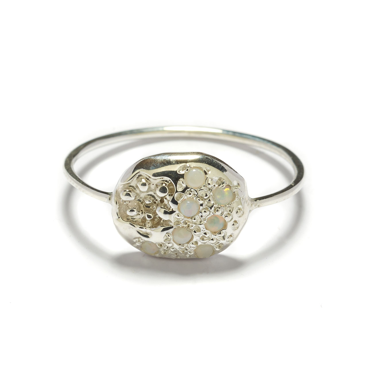 This sterling silver flower button ring features an organic floral carving. The ring is set with opal cabochons. Handcrafted by Elisa.