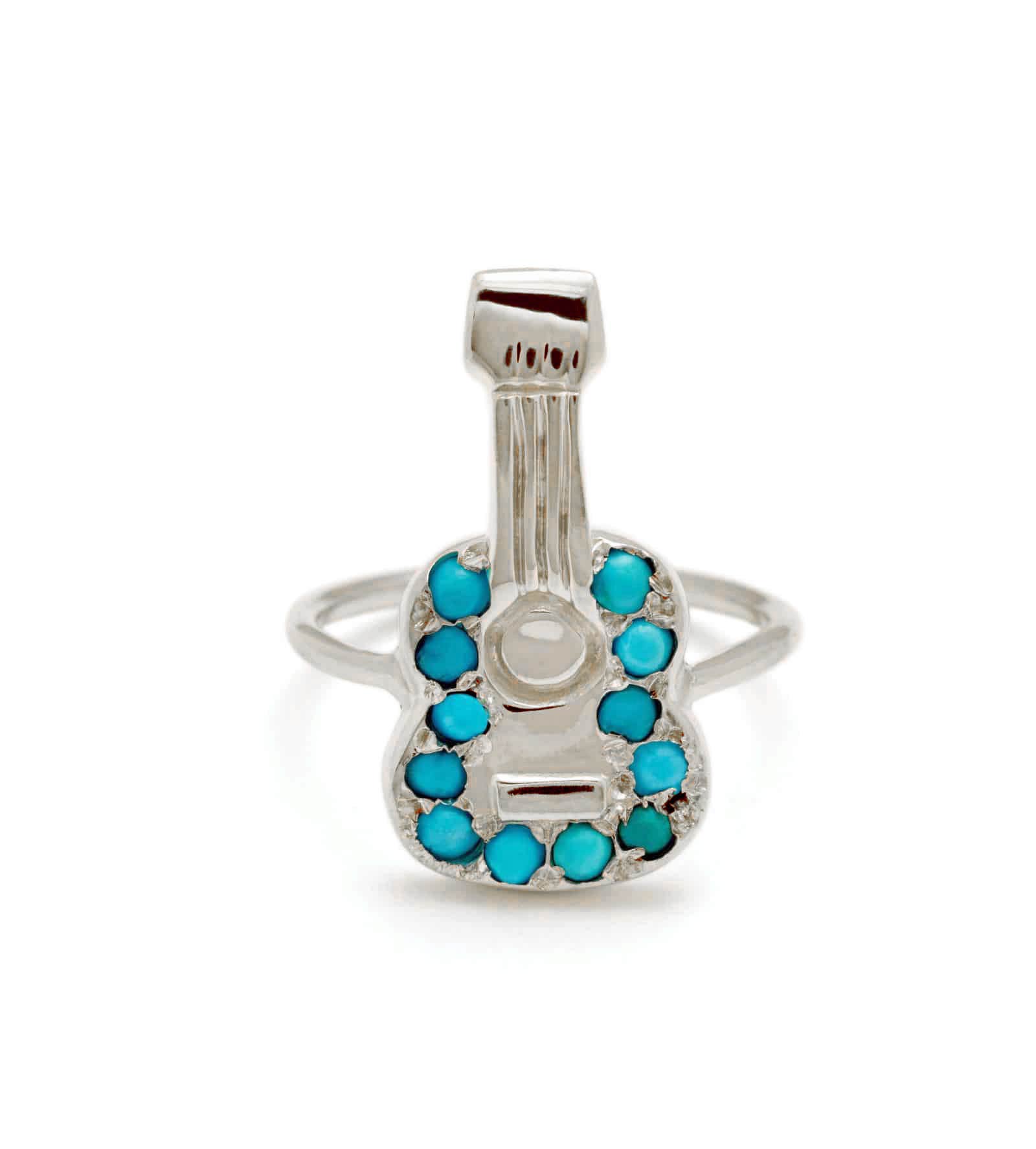 A dreamy music themed ring. This guitar ring is set with turquoise cabochons. Available in sterling silver. Handcrafted by Elisa.